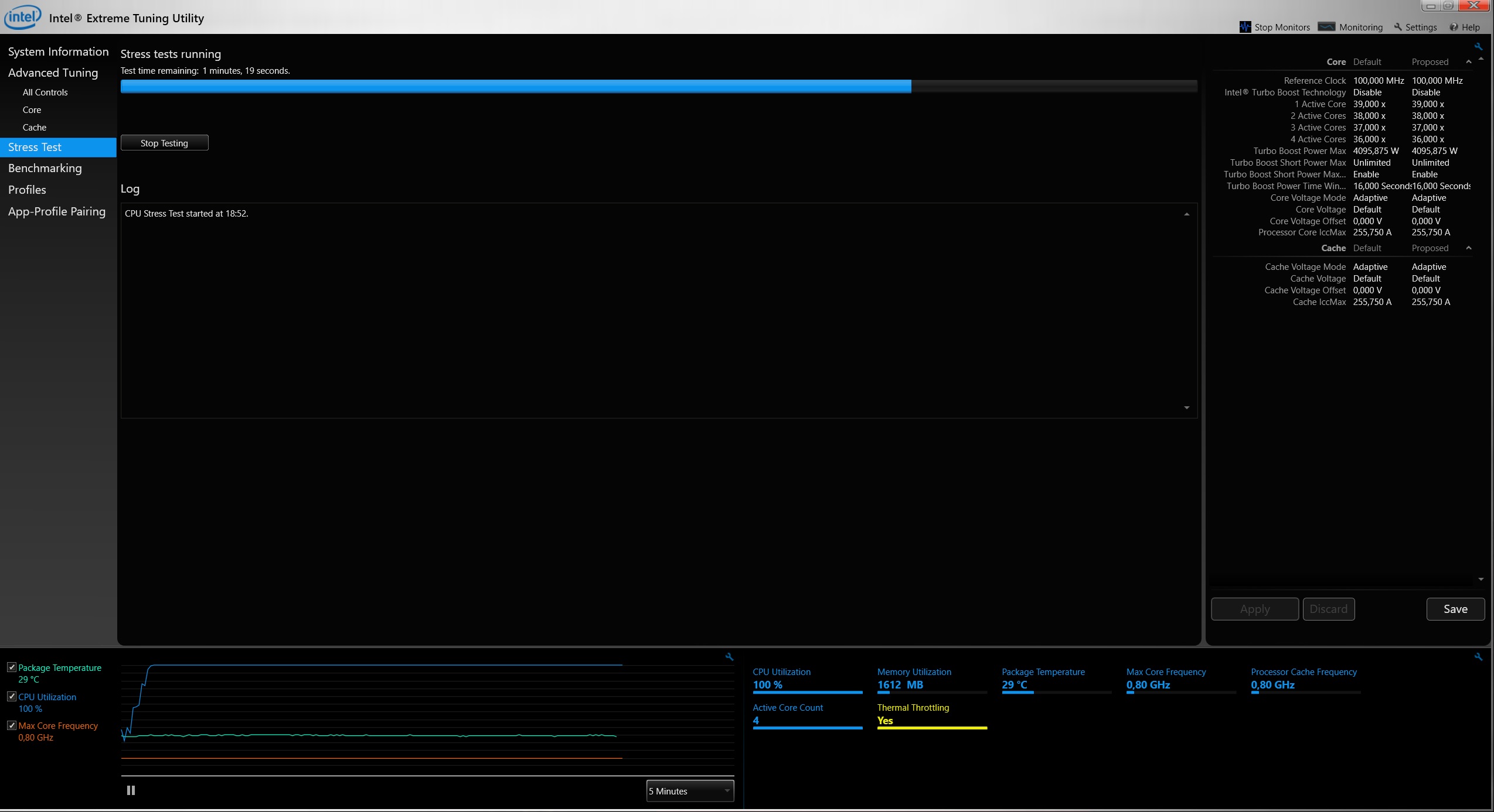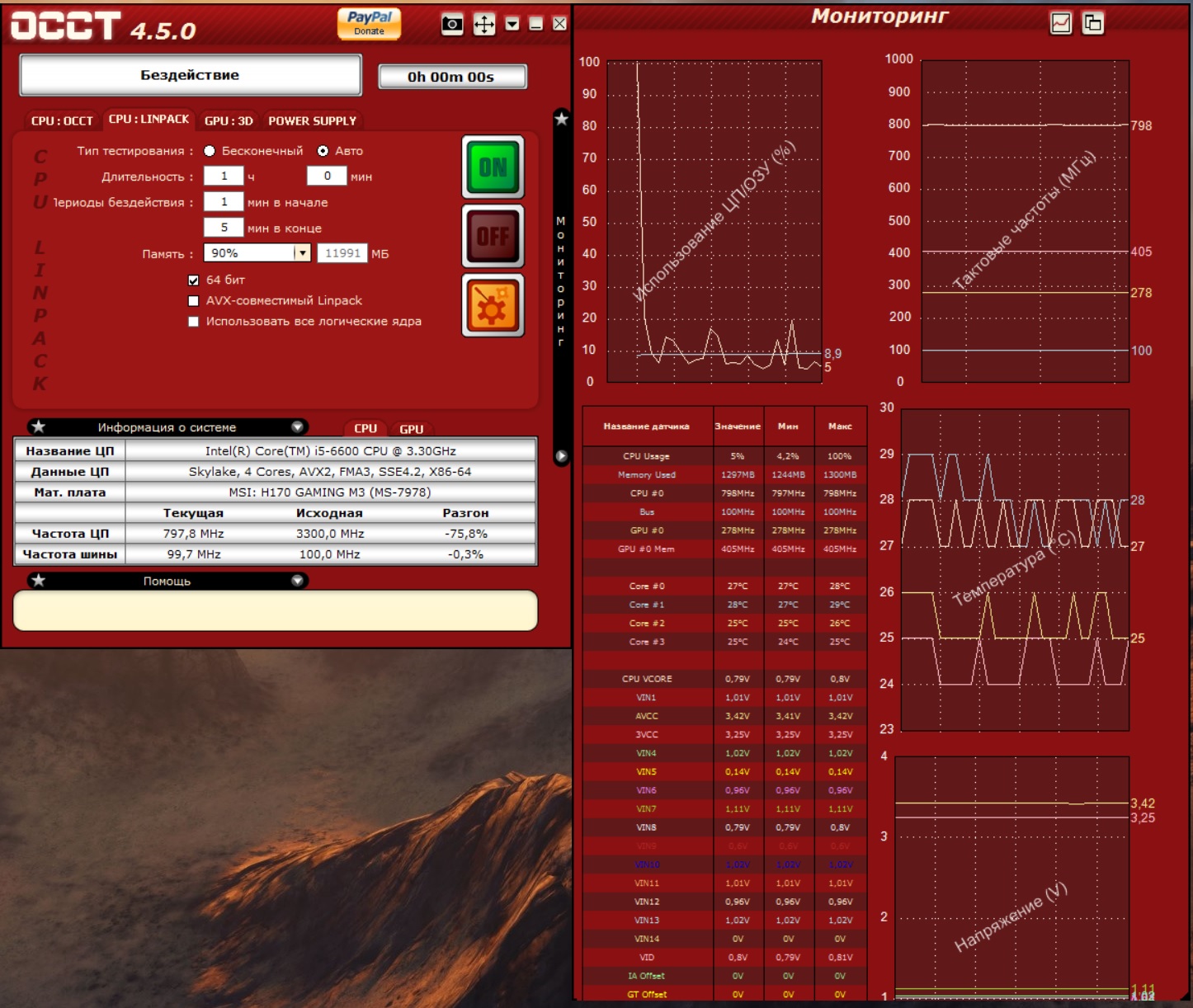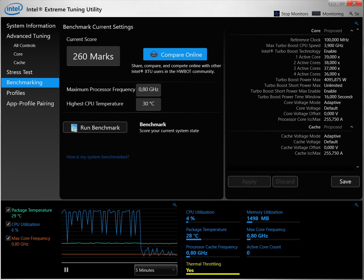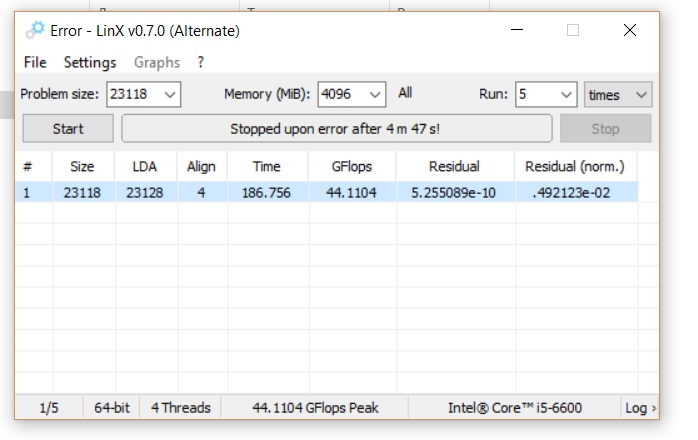 Всем добрый вечер! Отчитываюсь по своей проблеме. Провел тесты в программах OCCT, LinX и Intel Extreme Tuning Utility, а так же в 3D Mark прогнал Fire strike. Так же посмотрел в Riva Tuner загрузку CPU во время игры, она равна 100%, а частота процессора в это время 0,80 GHz . Похоже, что у меня с процессором какая то беда. При любой нагрузке его частота не поднимается выше 0,80 GHz и температура выше 30 градусов ни разу не поднялась. Посмотрите мои скриншоты, что скажите по этому поводу? P.S. LinX вообще какую то ошибку выдал.