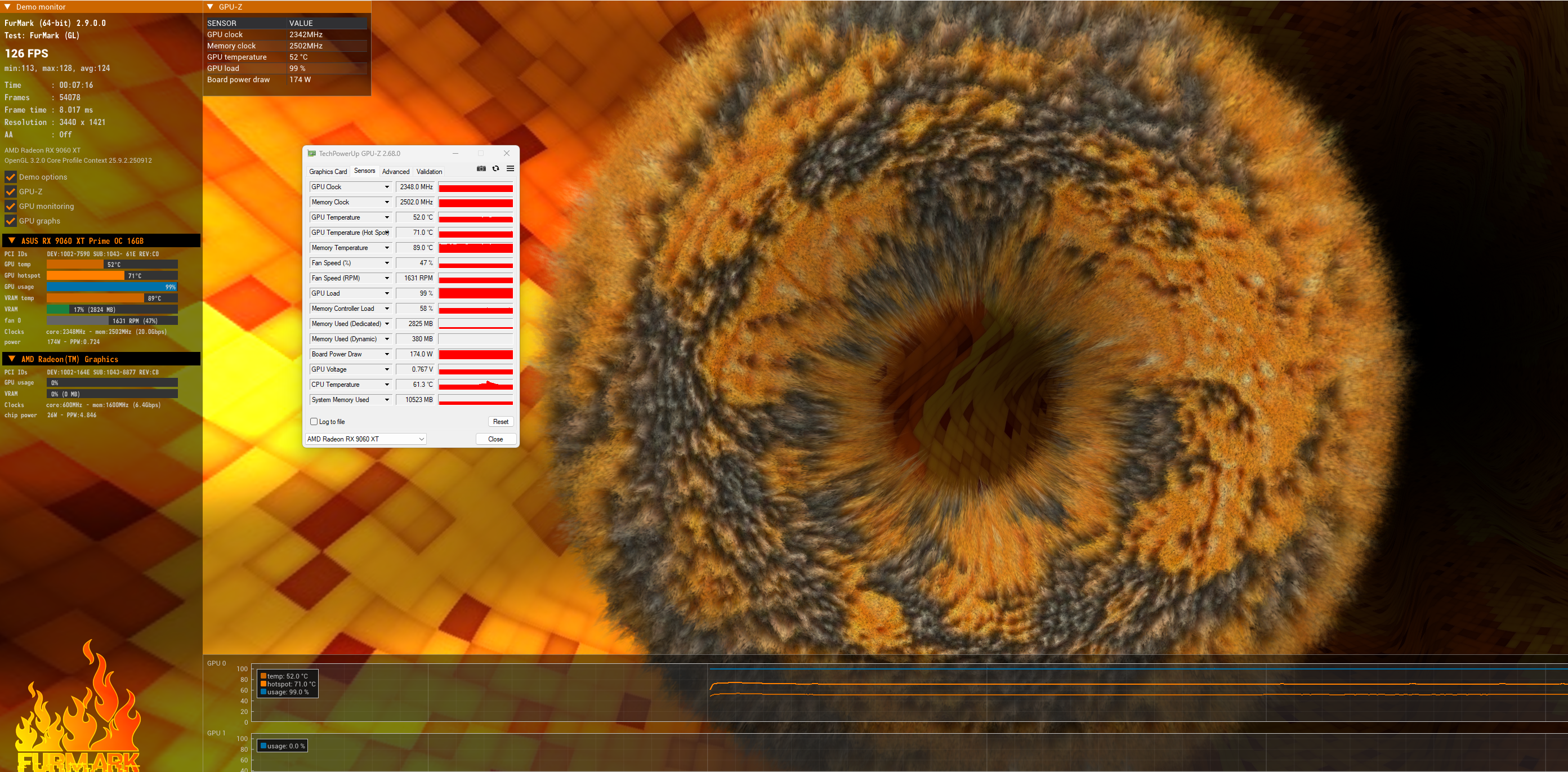 ASUS AMD Radeon RX 9060 XT PRIME OC - полный сток, протестировал оба биоса, снял пруфы на видео. Обычный FurMark 2.9.0.0 на 1920 \ 1080 до стабилизации температур. Карточка в закрытом корпусе: Корпуса Phanteks. Модельный ряд и опыт эксплуатации #18554407 корпусные все фиксированы по 1100 об\с ARCTIC P12 Pro PST. Это как примерно на 950 обычные крутилки, по шуму.