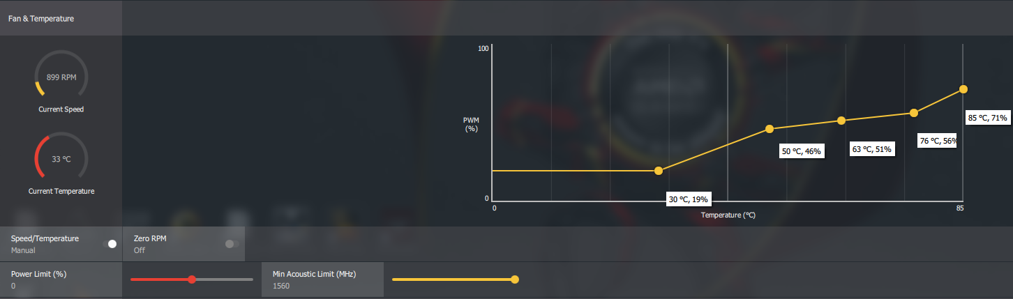 немного не корректно, в MSI AB получается более гибко настроить кривую за счёт свободного количества точек перехода, а в WattMan их всего 4 (1 не в счёт она мёртвым грузом определяет минимум), плюс ко всему у MSI AB гибкая регулировка оборотов, напротив же Wattman изменяет ступенчато на конкретно заданных значениях