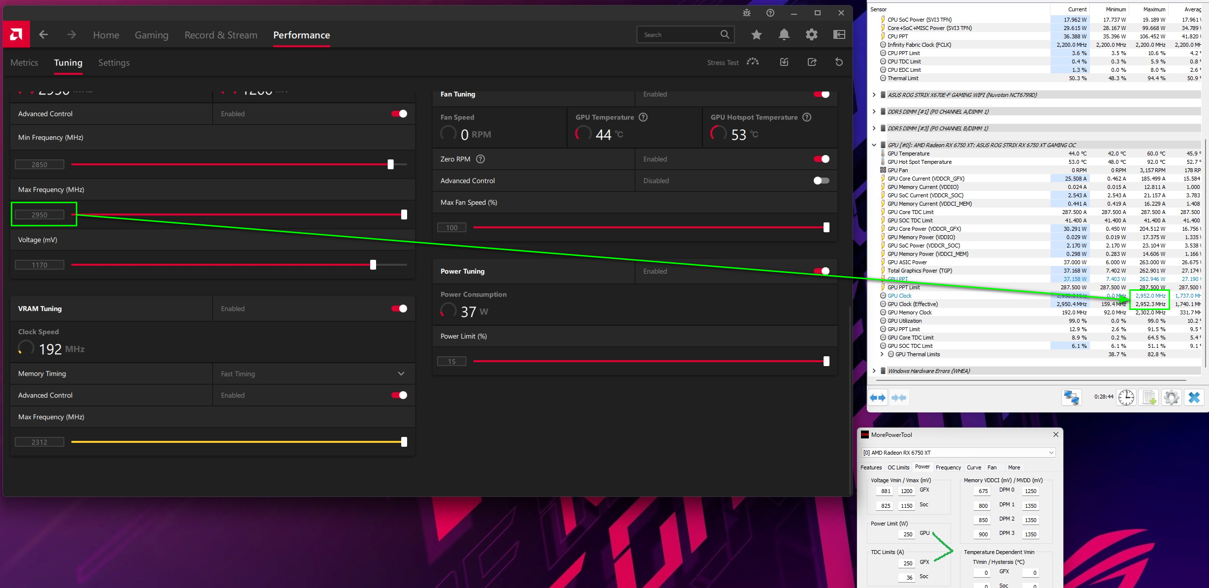 Я не спрашивал про частоты на скрине, он лишь для того, чтобы показать установленный в mpt power limit, и текущий в который упирается видеокарта. Эффективная частота при лимите 2950 ~2900мгц, т.е. она никак в этот лимит не упирается.