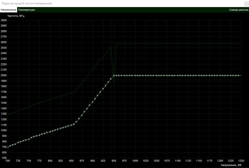 не правильно сделал, берешь над вольтажем точку которая тебе нужна и тянешь вверх до частоты, не закрывая график жмешь галочку и смотришь появилась как бы горочкой, в игре видно, что плоска горизонтальная при твоем ПВ должна быть как раз на этой частоте, я тебе советую 950-1000 тянуть до 2000-2050, но у 3070 обычной косяк с тем, что ей питания недостаточно, частота в районе 2000 в любом случае должна быть, только вольтаж начни с 1000, потом на 50 меньше, 950 и т.д. Если вольтаж будет слишком низкий для той частоты, то у тебя в некоторых играх может вылетать драйвер или просаживать частоту, поэтому советую 950-1000мв взять как основная напруга, на выходе лесенкой должно быть например 900мв-1870мгц, 950 - 1940, 1000 - 2020, выглядит будет как лесенка)