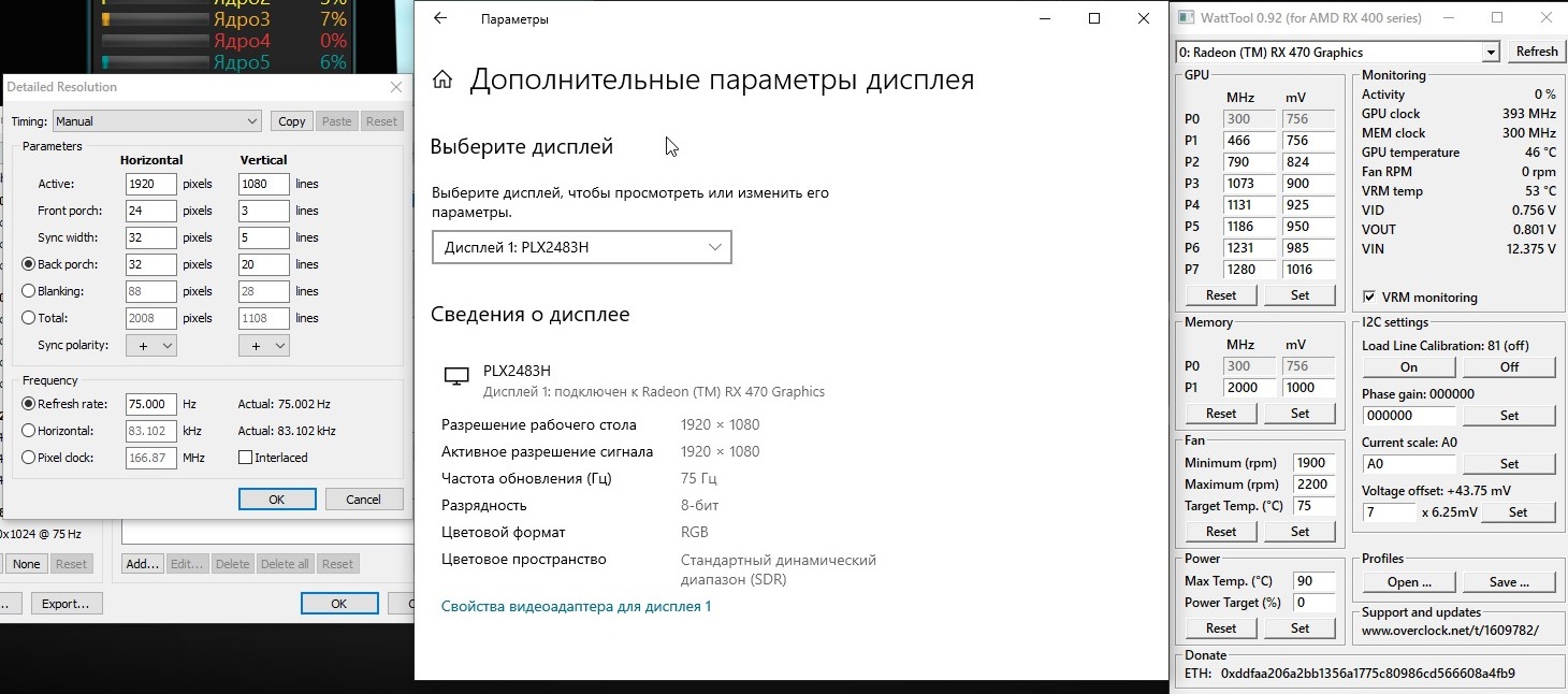 После двухдневных экспериментов сделала такие интересные выводы.Может быть будут кому то полезными. 1.Имеется rx470 powercolor red devil 4gb.При разгоне монитора до 75гц и ручном подкручивании параметров в cru можно добиться того,что частота памяти в винде висит на 300mhz,вместо максималки 2.После проб разных прошивок от rx570(powercolor,asus,sapphire) и кручении CRU для разгона монитора-ни в какую не удается сбросить максимальную частоту памяти 3.прошивки от 570 намного стабильнее в плане поднятия частот чипа.При браузере,youtube частота 300mhz.На родном биосе постоянно скачет 300-1100.Следовательно биос от 570 холоднее. Напряжения тайминги и частоты были приведены к одному знаменателю.Так что придется оставаться на прошивке от 470 из за 75гц и минимальной частоты работы в простое