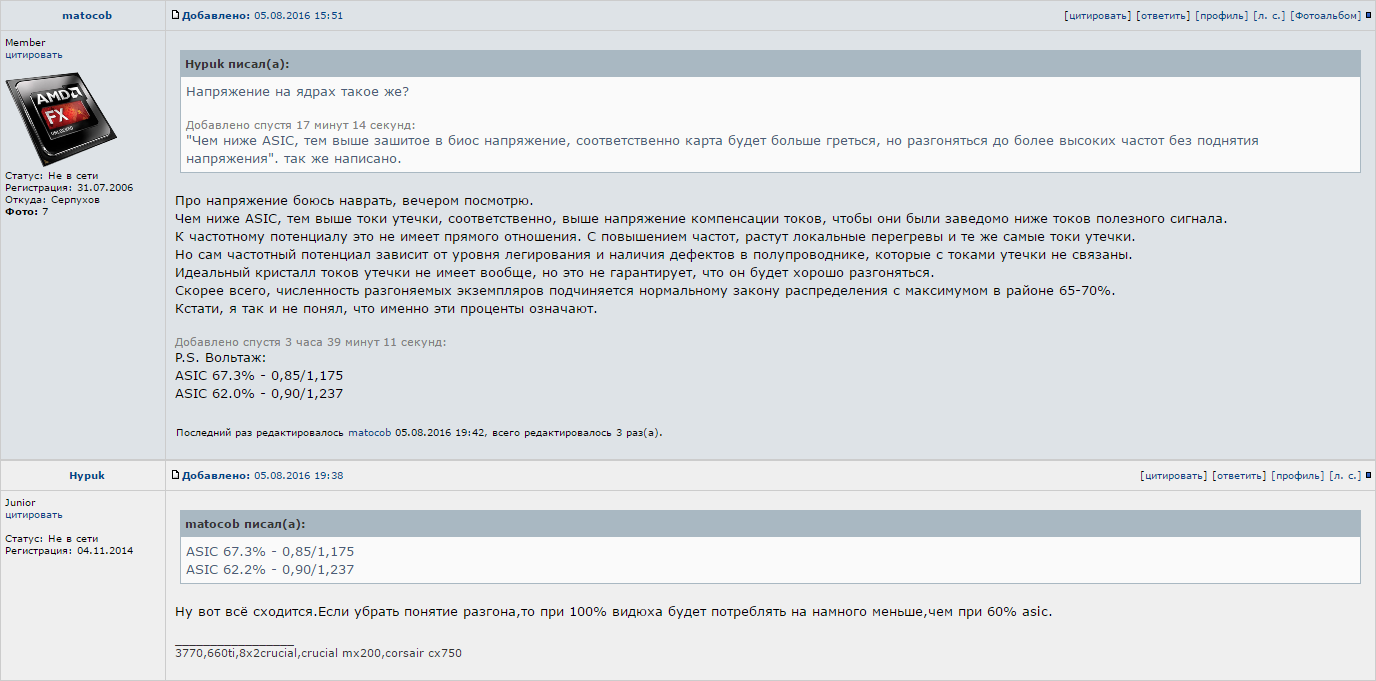 У нас в ветке 480 вообще с асусами ересь творится, у Асусов чем ниже АСИК, тем круче карта(по моим наблюдениям), и у асуса никогда не бывает АСИК выше 75%. А вот у остальных под 90. Мне кажется, что лучше сравнивать АСИК в рамках одного ведора но на разных моделях, чем в рамках одной модели но у разных вендеров. Пример с асусом, с аномальным результатом: Всё об AMD Radeon RX480, RX470, RX460 (Polaris 10 & 11) #14181363