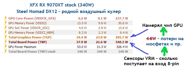 max. TGP у тебя было 326W, при этом TBP как ни в чем ни бывало 340W. Почему так? Всё просто - TGP считает сам GPU, а TBP идет в телеметрии с VRM и масштаб этого значения TBP настраивается вендорами. Поэтому, прибавив к TGP еще ватт 10 (всякие вентили и прочие RGB) будет 335W из 340W. VRM c такой эффективностью нет в природе, на всех 9070XT они +- одинаковые, и их эффективность около 85-87%. Т.е. чисто эмпирически, твоя карта в Steel Nomad DX12 в стоке потребляет около 375W. Отсюда и 7315 на воздухе. Потенциальный минус - лишняя (и главное, непредвиденная или неучтенная) нагрузка на БП, и если с ним не все норм - могут быть проблемы, плюс еще сам чип может попасться так-себе - тогда и без БП гемора хватит. Но это крайние варианты. Думаю, переустановка дров на "чистую" поможет, да и чистка хвостов от предыдущих сэйвов/конфигов.