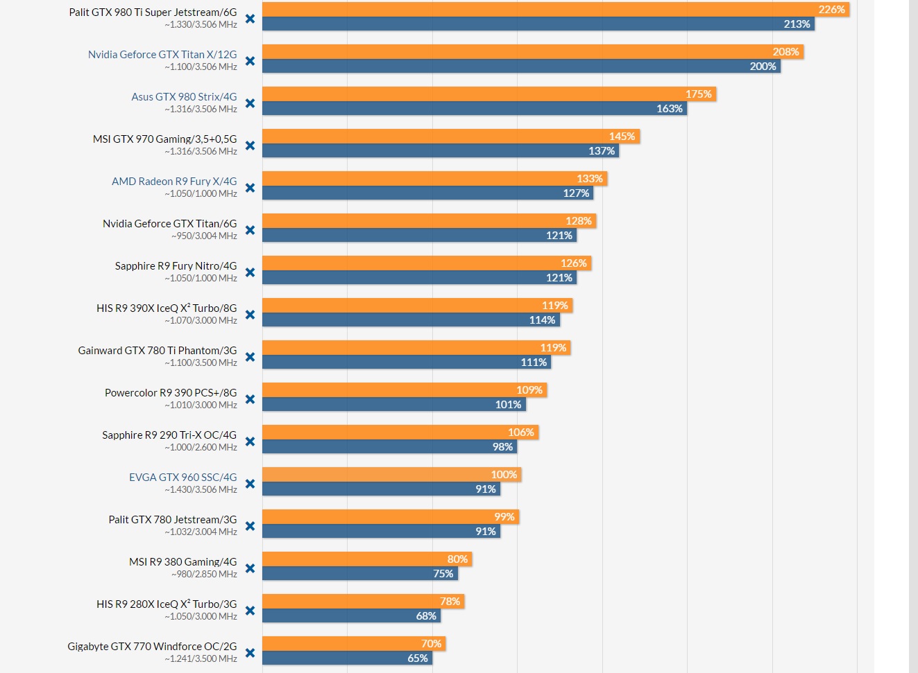 https://www.guru3d.com/articles-pages/m ... iew,1.html Вот вполне адекватный обзор. Как бывший владелец двух 770ых могу сказать, что они в сли обгоняли сначала мою 390х и потом 980 в Tomb Raider первом. В которой отличный бенчмарк и оптимизация. Отсюда и вывод, что 1 770 слабее 970 всего на 20-30%.