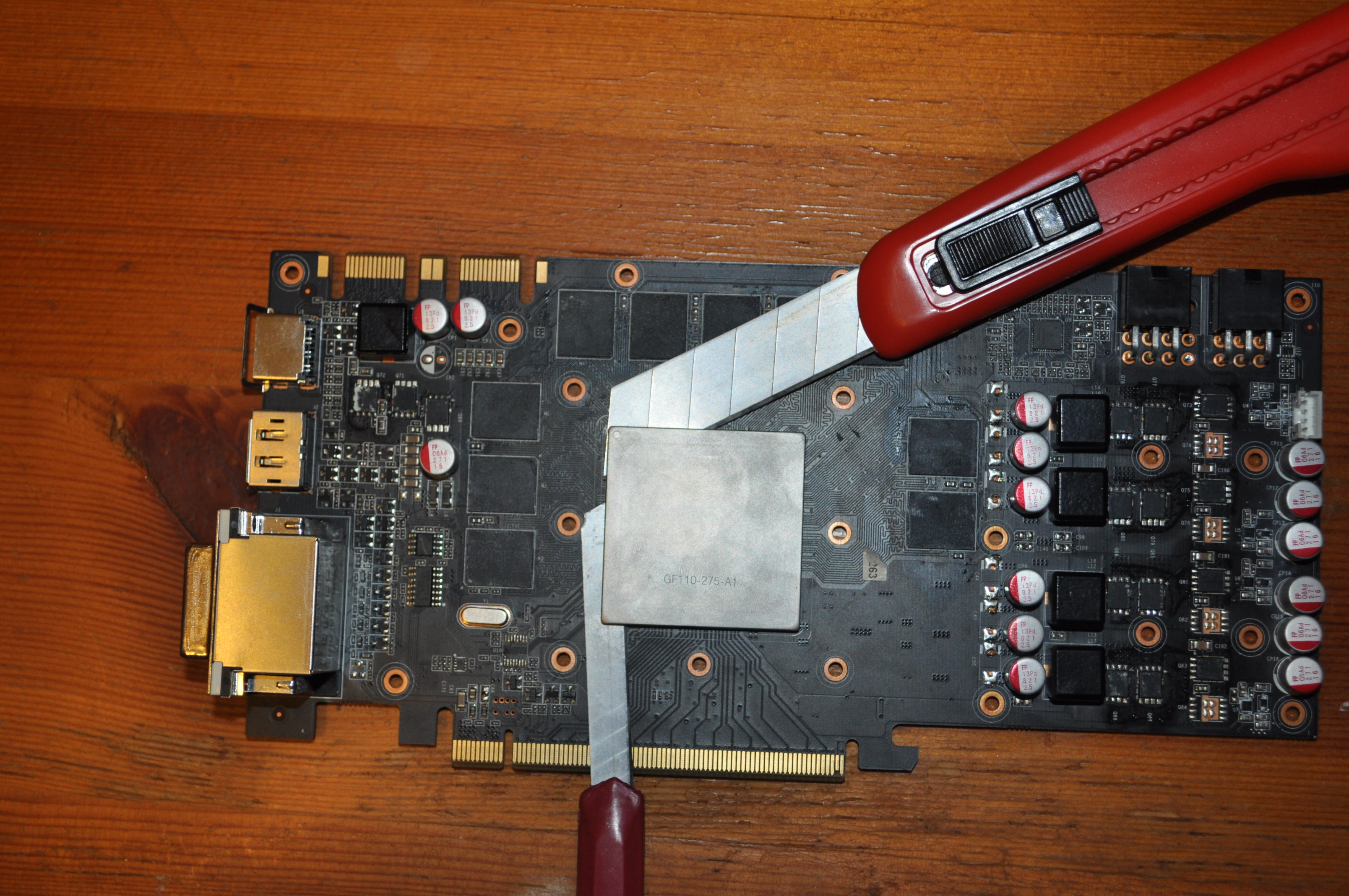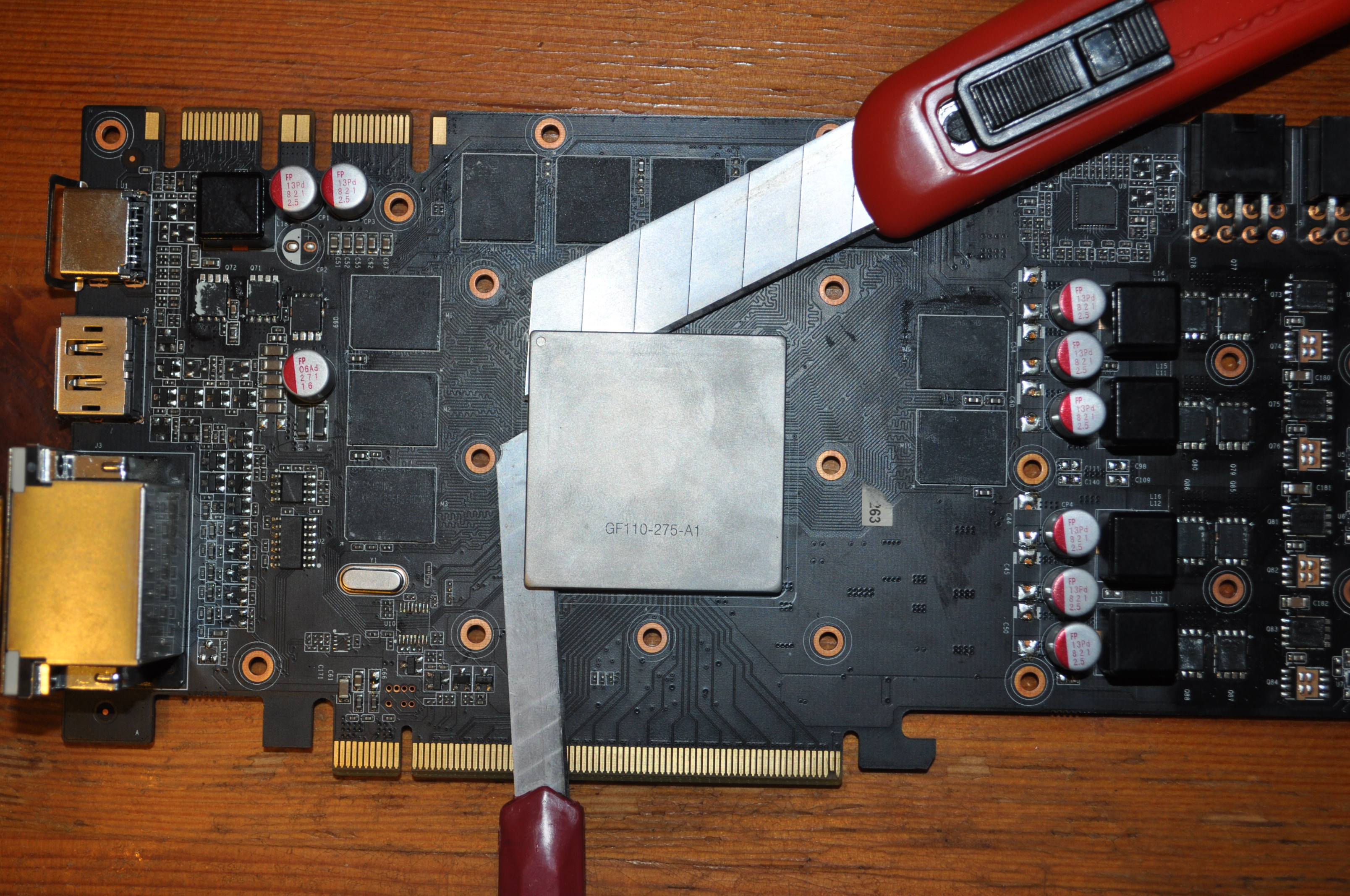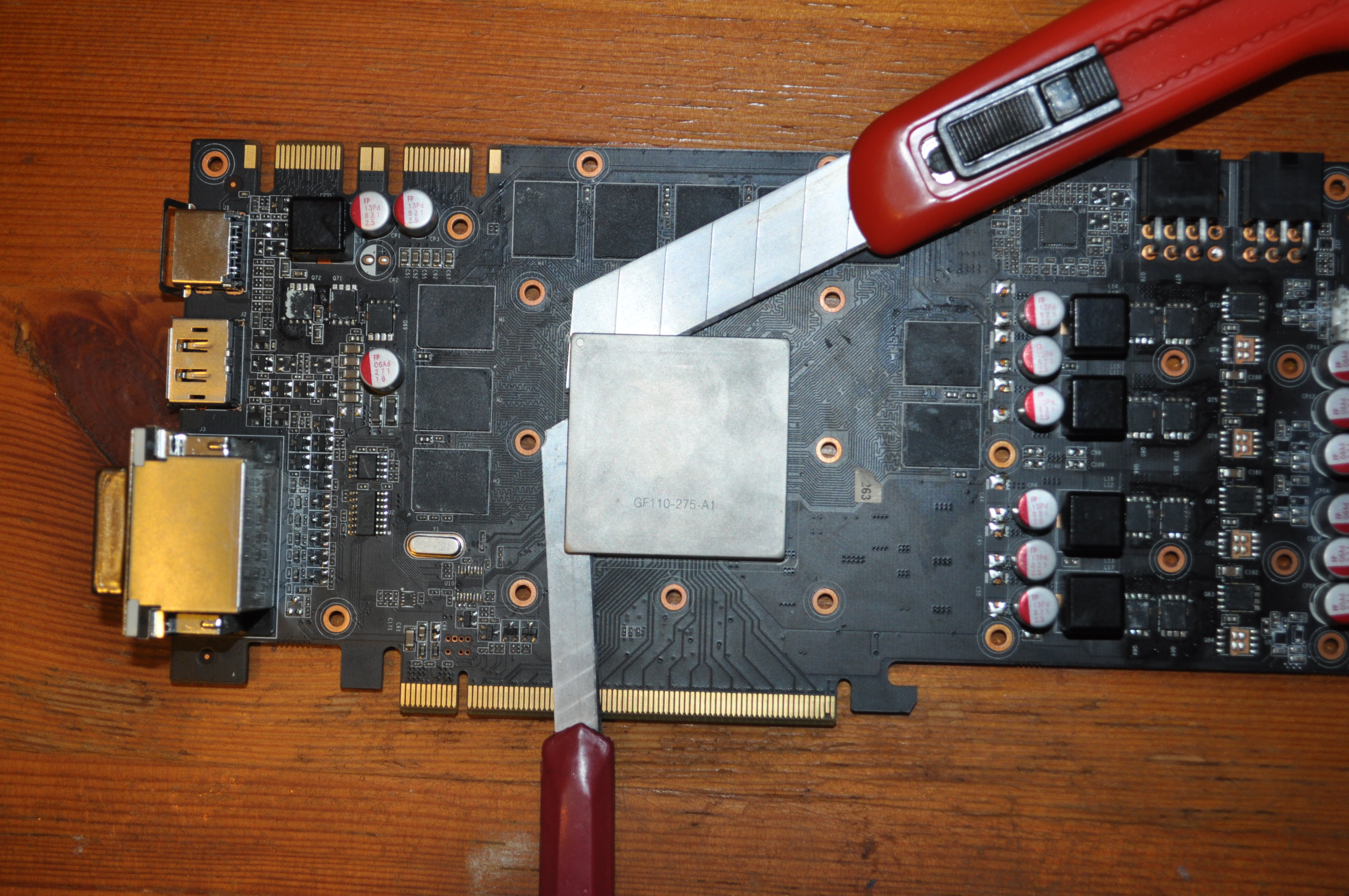 Ура!!! Парни! Снял крышку с ГПУ на своей Gigabyte GTX470 WF3 Мой первый опыт! Обернул карту бумагой для утепления окон, в верхнем левом углу засунул обычное лезвие для бритья под крышку на 2-3 мм.После обычном феном для волос грел крышку минут 7-8 точно.Температура была очень высокой, не прикоснуться к крышке.После еще чуть глубже засунул лезвие и еще погрел феном минуты 2-3.После вынул лезвие и обычный кухонный нож засунул под крышку на 2-3 мм.Ну а когда нож плотно засел внутри, просто начал поворачивать нож (как бы поставил его на ребро) и крышка отлетела! После обнаружил там высохшую термопасту и удалил ее. #77 #77 #77
