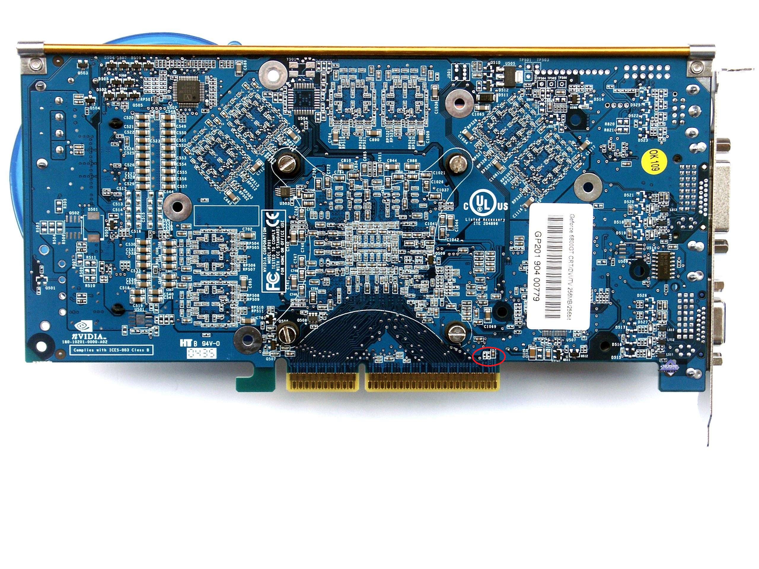 Народ, а есть еще среди нас люди которые смогут подсказать по номиналу сбитых элементов на AGP GF 6800 GT от Galaxy. У слота AGP сбита пара резюков и перебита дорога. Номинал резисторов неизвестен. Забавно что карта вроде как работает и без них с восстановленным контактом перебитой дорожки, но вдруг детальки важные? Жалко карточку. Это референс дизайн потому в принципе проще с идентификацией элементов.