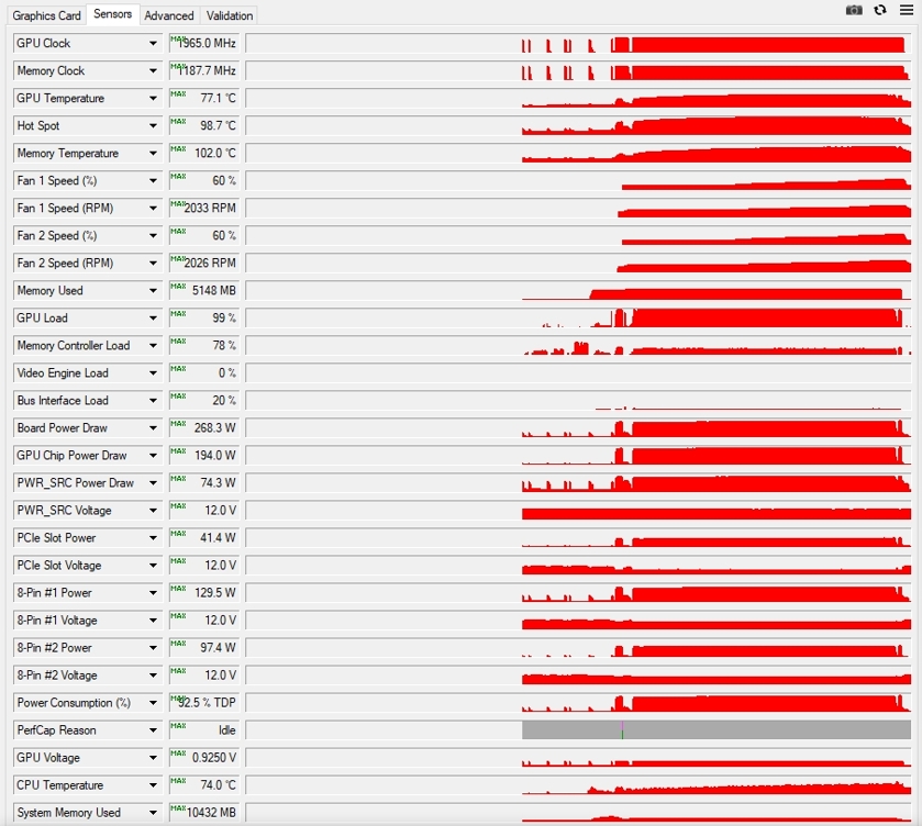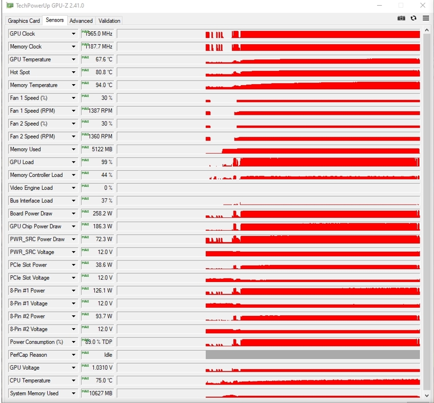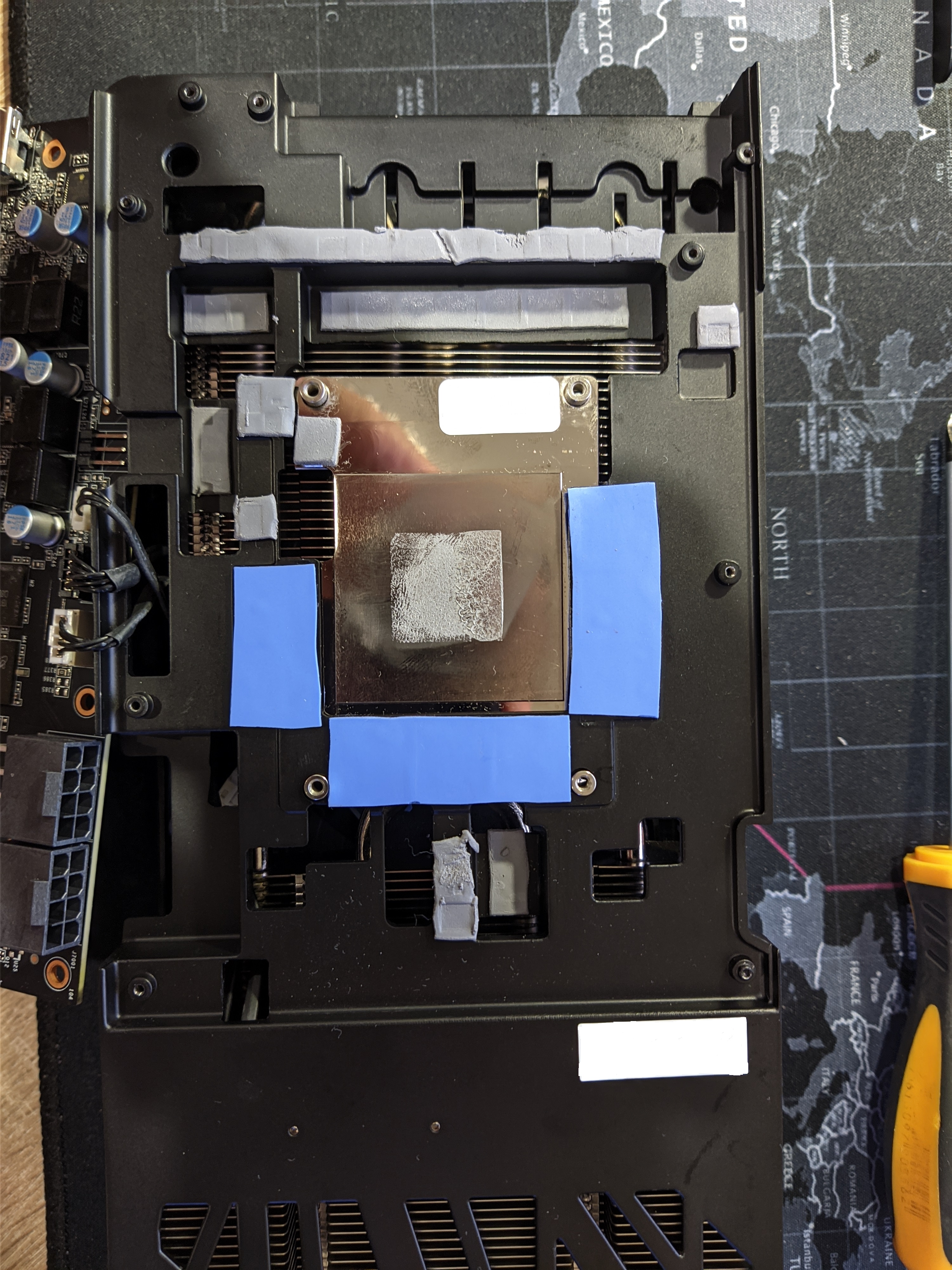 Отпечаток уже даёт о себе знать и выявить проблему высокой температуры GPU. Стал разбираться, что не так с памятью. По итогу оказалось, что толщина термопрокладок в 1 мм для расположения между пластиной чипов памяти и радиатора большая. Полез в интернет за поиском информации. Выяснилось, что туда подходят термопрокладки толщиной в 0.75 мм. Естественно, в продаже таких нет, делать слой из них тоже не вариант. В итоге от этой идеи отказался и собрал всё обратно: термопрокладки заводские, паста MX4. Собираем, запускаем игру: