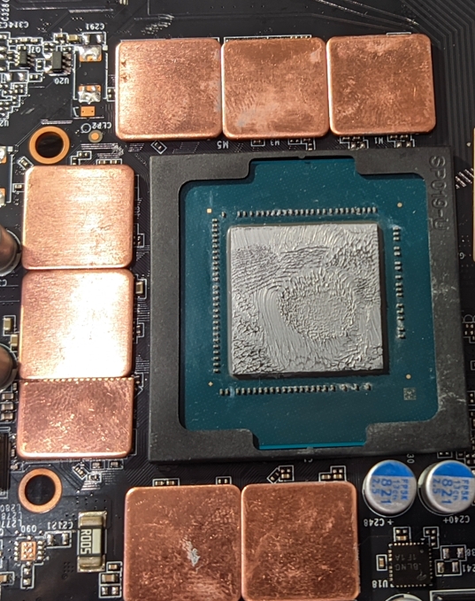 И вот тут начались проблемы. Если с температурой памяти я уже смирился, то температура чипа стала новой проблемой. Тут началась эпопея по разборке и сборке, выяснении причин, что могло пойти не так, ведь до всего вмешательства всё было вполне нормально. Температуры чипа, конечно, не были низкими, но и не 83C'. После нескольких 2-3 таких разборок стало ясно, что проблема кроется в недостаточном прижиме радиатора к GPU. По отпечатку он хороший: