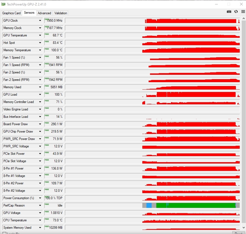 YOBA-1 У вас в GPU-Z установленны флаги макс. значение. 1,08v ,карта бустит на короткое время упираясь в лимит по вольтажу (PerfCap-vRel, зелёный цвет) сбрасывая частоту, и происходит это в конце сессии, я так понимаю в меню игры, остальное время карта работает на др. вольтаже. Это некорректное сравнение. Ну и в Pwr limit долбит всю сессию. Хотите холодней - попробуйте найти макс. частоту на 0,950mV или ниже, хотя ваши 68гр. на 0,975mV в пике вполне даже нормально. Или агрессивнее настройте кривую вентиляторов.