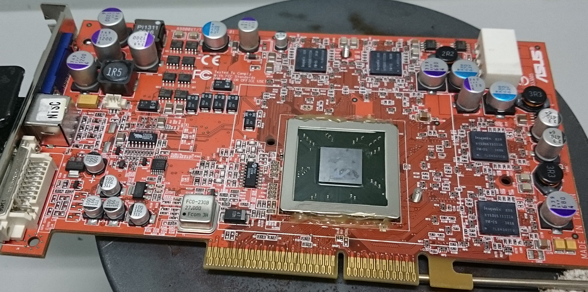 Итоги: Первой жарил X800 XT. Я неправильно расположил щуп и не учел неравномерность нагрева поверхности плитки. В итоге карту я существенно перегрел, настолько что с обратной стороны печатной платы один smd-элемент отвалился и упал на плитку. Также я подложил под чип ATi Rage теплоизоляционный материал, из-за непосредственного физического контакта с которым пара smd-конденсаторов сдвинулась с места. В завершение всего этого безобразия текстолит на обратной стороне платы вздулся из-за перегрева. Я конечно все припаял, но карта не заработала.
