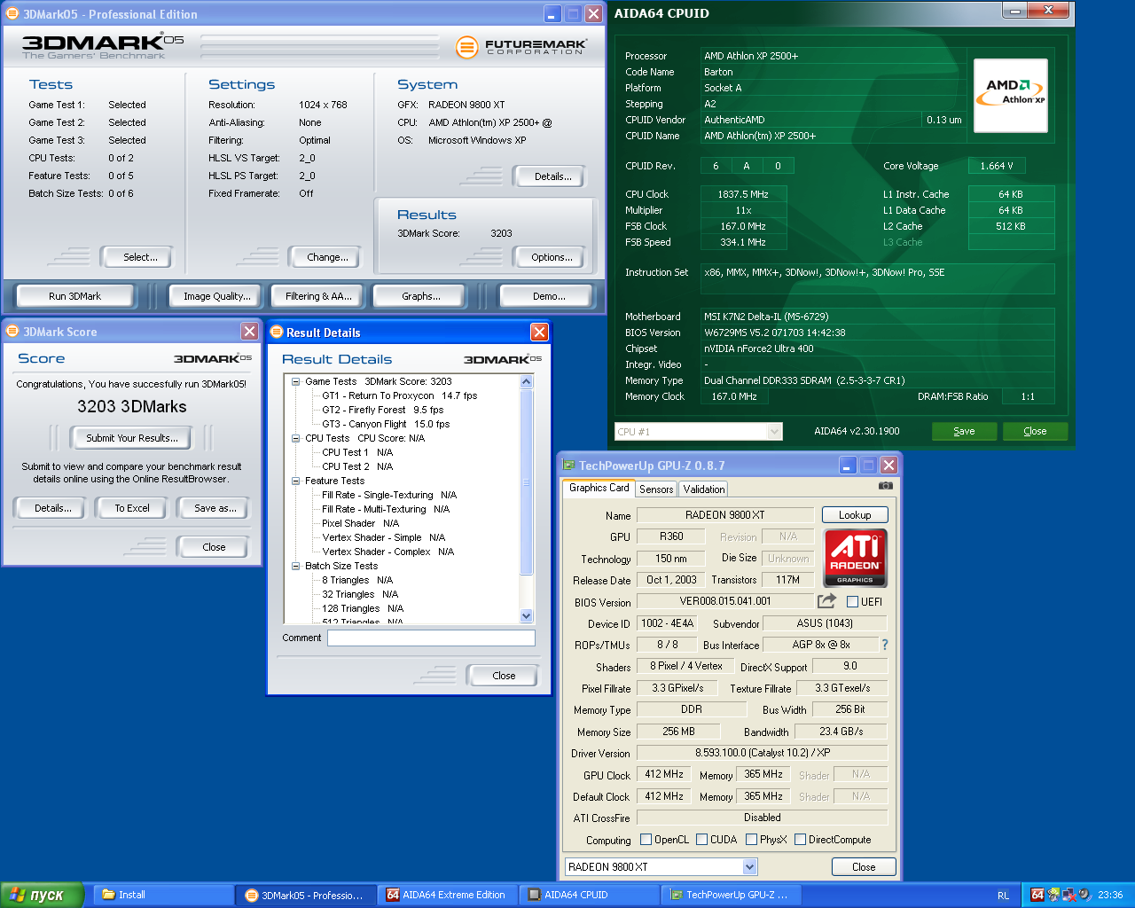 Второй жарил 9800 XT с учетом анализа своих ошибок. В разделе выше "как делал" написано все с учетом исправления этих ошибок. Результат - артефакты исчезли, драйвер не ругается, марки крутятся.