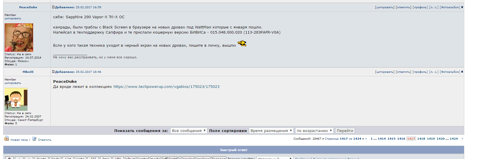 Здравствуйте, на моей видеокарте R9 290 tri-x OC UEFI (Память hynix, bios 015.044.000.011.000000) с новыми драйверами которые пошли с января вылетает синий экран, на старых драйверах 16.11.5 такой проблемы нет и все корректно работает, есть ли более новая версия bios на мою карту ?