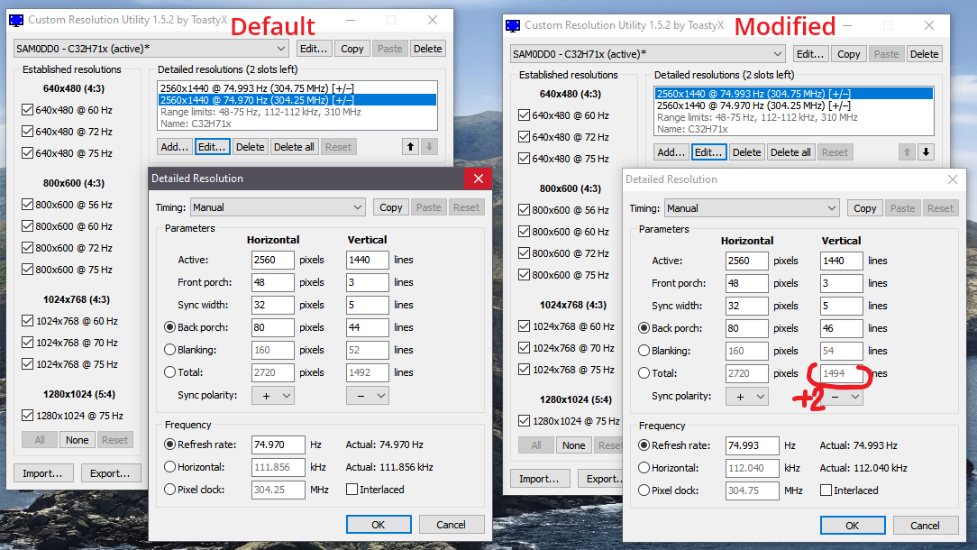 Если делаю для 75 то не срабатывает, ни в CRU ни в адреналине, не знаю в чем дело, можно поднять до 76, тоже будет частота в половину, но тогда выходим за пределы 48-75 в фрисинк