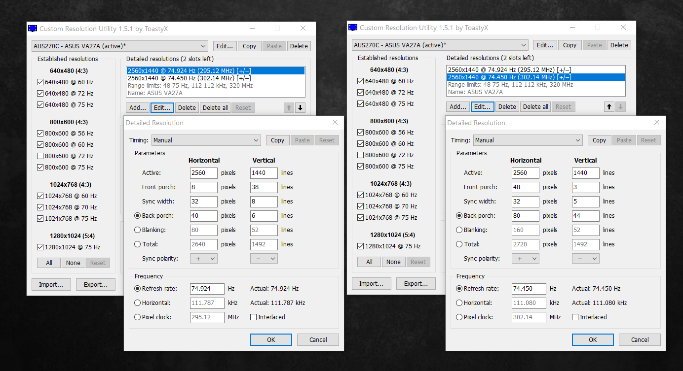 Вот, слева дефолт монитора на 75, справа тот который сейчас использую на 74 с cvt rb standart, довольно сильно отличаются, все цифры
