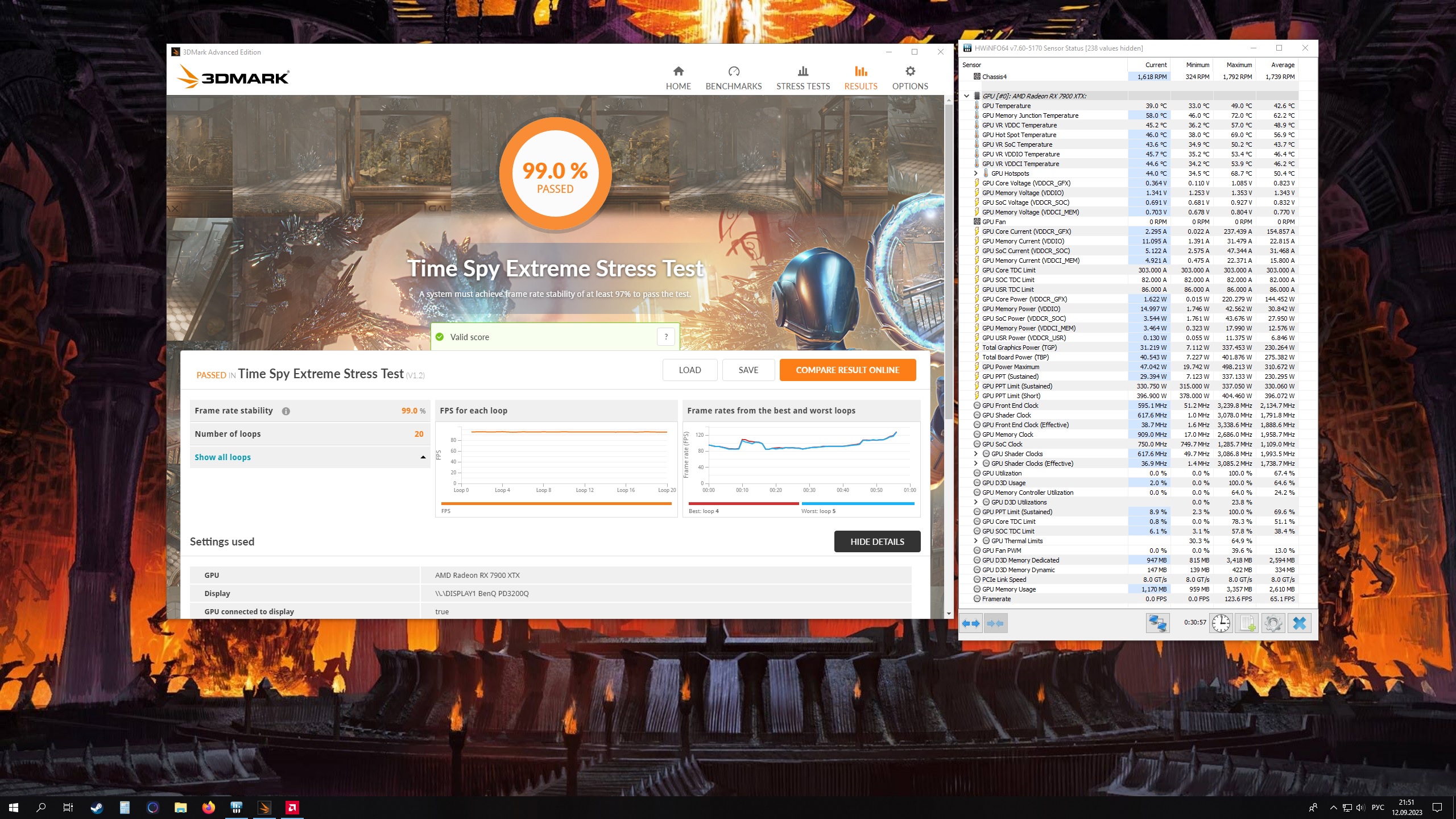 Попробуй целевую частоту 3050 МГц по чипу и 2700 МГц по памяти поставить. На водяной Red Devil 7900XTX результаты выросли в 3DMark в сравнении с 3200 МГц. Вольтаж - авто с PL+15%.