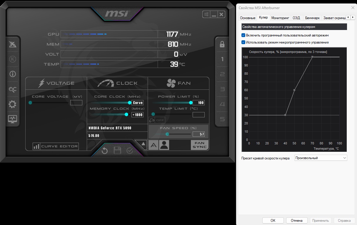 Блин, всё никак не могу разобраться с вентиляторами. Утилита палита отключена, настройки - на скриншоте. Запускаю стресс, температура чипа поднимается до 57 градусов и включаются вентиляторы на 68% сразу. Выключаю нагрузку - температура падает до 39 примерно и вентиляторы отключаются. Далее в простое карта нагревается потихоньку до 50 градусов, ничего не включается. Запускаю стресс и по кругу.