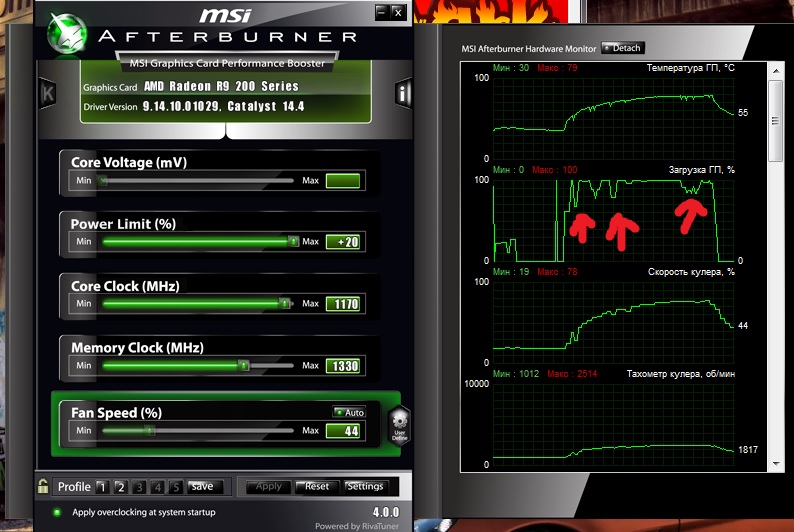 mishavk запусти фурмарк с мониторингом gpu-z и там гляди просадки gpu-load, если с ним есть скачки частоты - гпу троттлит, у тебя 79 градусов вон судя по статистике.