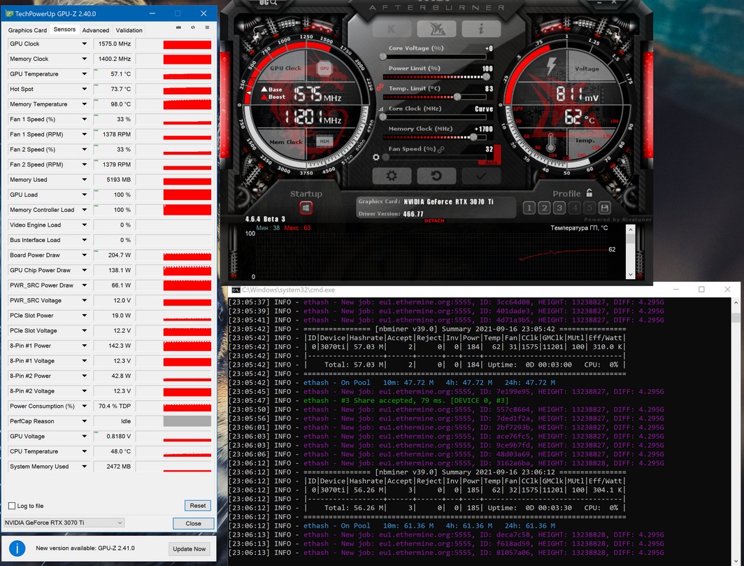 Младшая палитка умеет как-то так. 98 градусов по памяти на минимальных оборотах в тесном корпусе это вообще без вмешательства в СО, при этом не 46 хешей, а 57. Боюсь представить что будет на TUF и GameRock если запустить не лёгкий эфир а ворону.