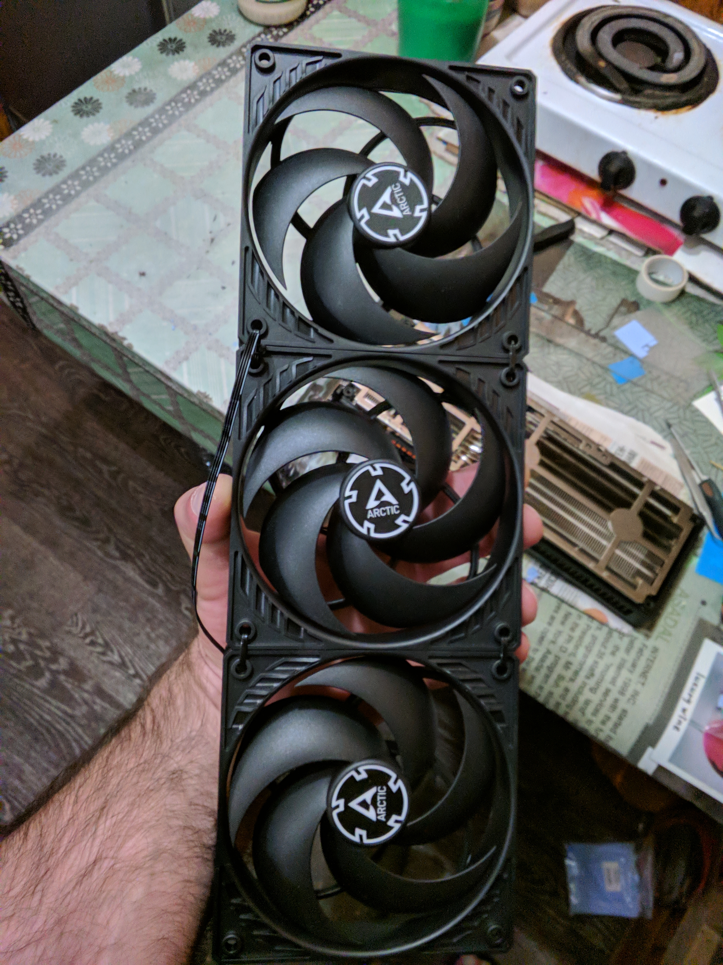 Пока стоят артики p12 они на 1300-1400об по эффективности как стоковые на 2200об, но зато шума вообще нету как будто играешь без видеокарты так как все вертушки видеокарты неприятные на слух, сейчас едут ко мне комплект вентилей Thermalright TL-C12 Pro, буду их ставить вместо артиков, так как они хоть и бесшумные но слабоватые по потоку.