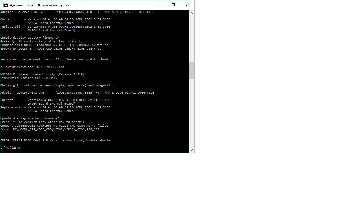 Всем привет. Сегодня стал обладателем GTX 970 GAMING 4G. ASIC у карты 76,6. Через afterburner получилось подобрать частоты 1557@8000 при напруге 1.256. Всё это дело я внёс в отредактированный bios, но в итоге при прошивке получаю вот такую картину В чём может быть проблема?