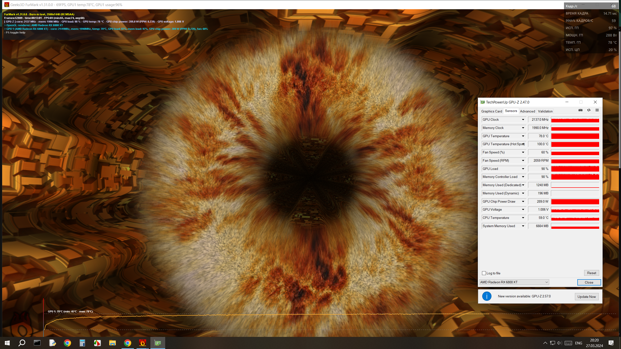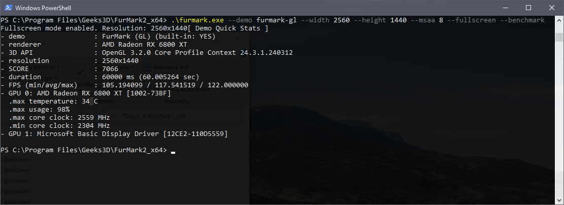 Всем привет, купил реф карту RX 6800XT Nitro +, решил прогнать в фурмарке и сравнить с тем что у людей на ютубе чтобы если что не так вернуть ( есть такая возможность).