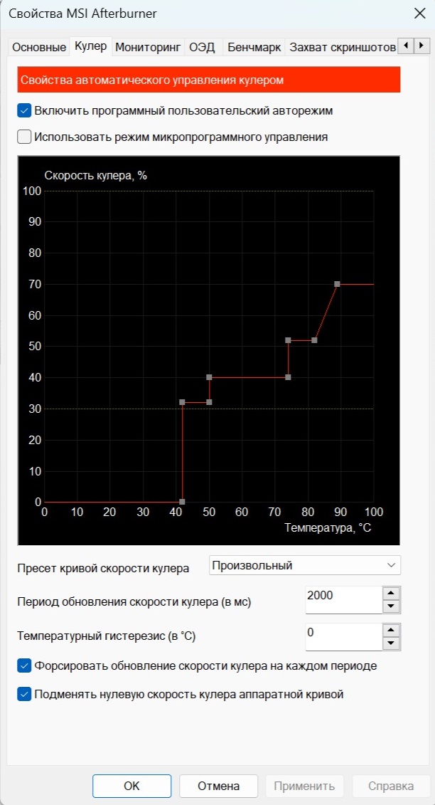 Метод борьбы один - настройка кривой вентиляторов ступеньками с обходом резонансных частот наподобие как на картинке, чтобы карта стартовала на 32%, потом уходила сразу до 40%, которых хватает чтобы держать на ней 73-74 градуса.