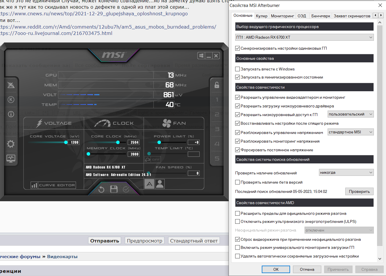 парни, подскажите пжлста. Проблемы с мониторингом rx6700xt - в простое значения частоты ядра, памяти, и напряжения падают в ноль, по показаниям HWinfo, gpuz и афтербернера. В нагрузке все норм. Так и должно быть ??