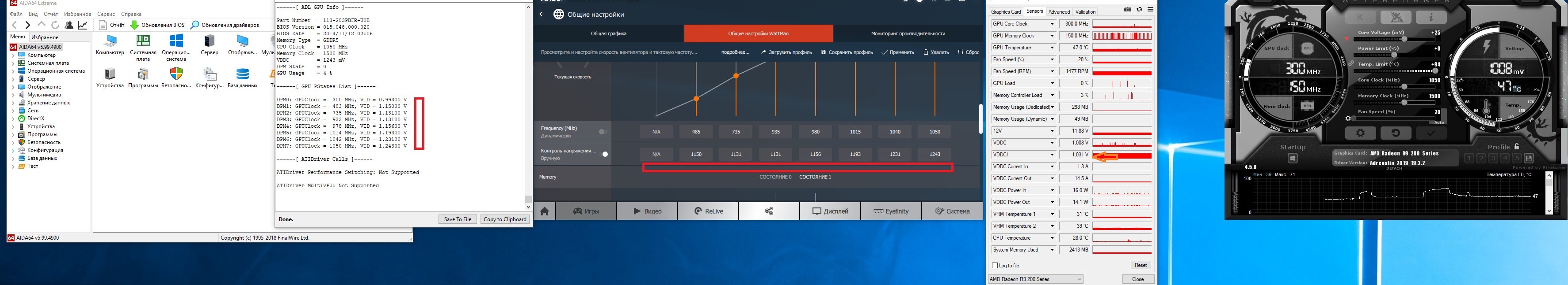 АИДА - показывает (датчик "ядро ГП" ) напряжение меняется от начального (DPM0) до максимального (DPM7) зеленая стрелка