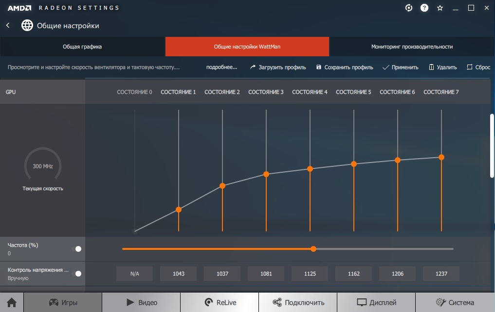 Она не указывается, ты не в курсе? Там слева только % указаны от стоковой частоты и посередине шкала с ползунком без частоты GPU. Двигаешь ползунок вправо - частота растет в % слева. Чтобы поставить 1155 Мгц мне нужно увеличить частоту стока на 12%. Для памяти частота указана, слева ее видно в Ваттмане и ползунок на шкале посередине регулирует частоту с шагом 5 Мгц.