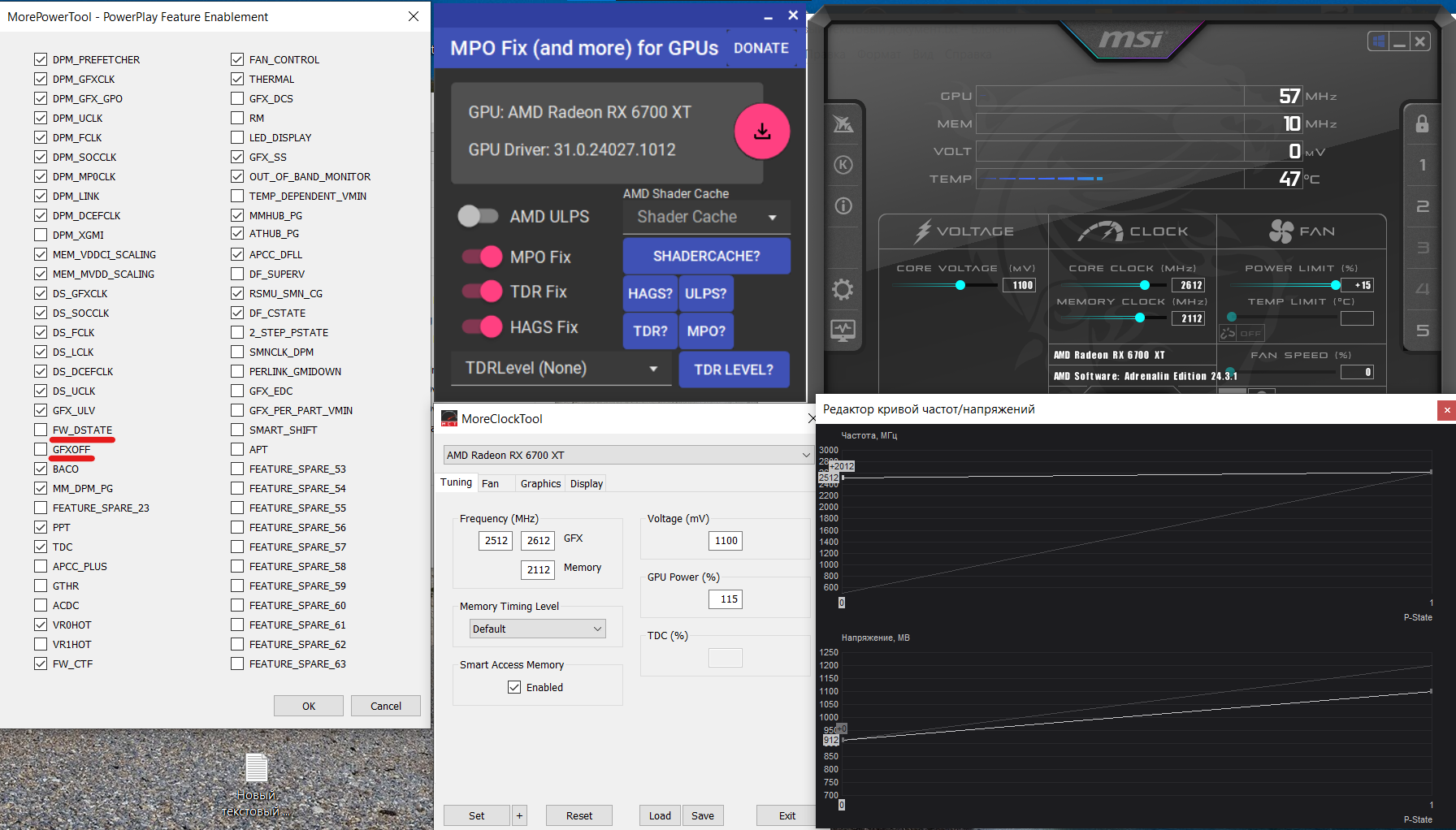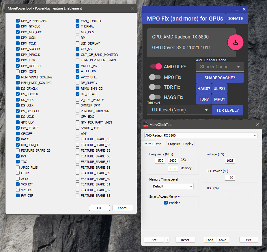 от черных экранов выключил энергосбережение - gfxoff, dstate, mpo. Остальные фиксы (ulps, tdr, hags) до кучи. Дельта gfx в 100мгц от просадки частот в некоторых играх, у меня также влияет на мин напряжение в простое, не комильфо но иного способа форсировать буст не нашел. Небольшой разгон памяти для проверки - если проблемы в ней то проявятся быстрее. FT синтетику держит, игры нет. По чипу +20mv от минимально стабильного. Весь uv в ab.