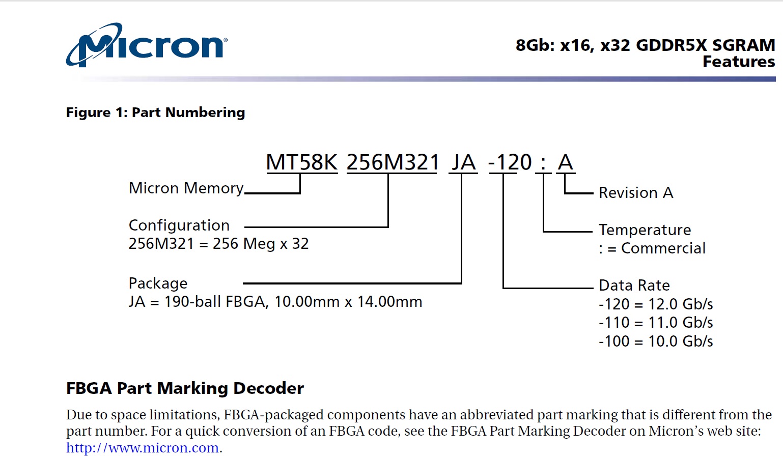 Fenor Вот некоторые скрины из сайта Микрон. Где черным по-белому написано что для 10 и 11 Gbps используются разные микросхемы. Но все они относятся к типу памяти GDDR5X. Есть еще и микросхемы 12 Gbps. Одним словом нет разных микросхем с частотой 11Gbps. Она одна. Изначально ставилась только на тишку. Если на какой то ещё другой карте вдруг появится память с базовой частотой 11Gbps - это будет та же память которая стоит в тишке а не какая-то другая. Другой просто нет в природе.