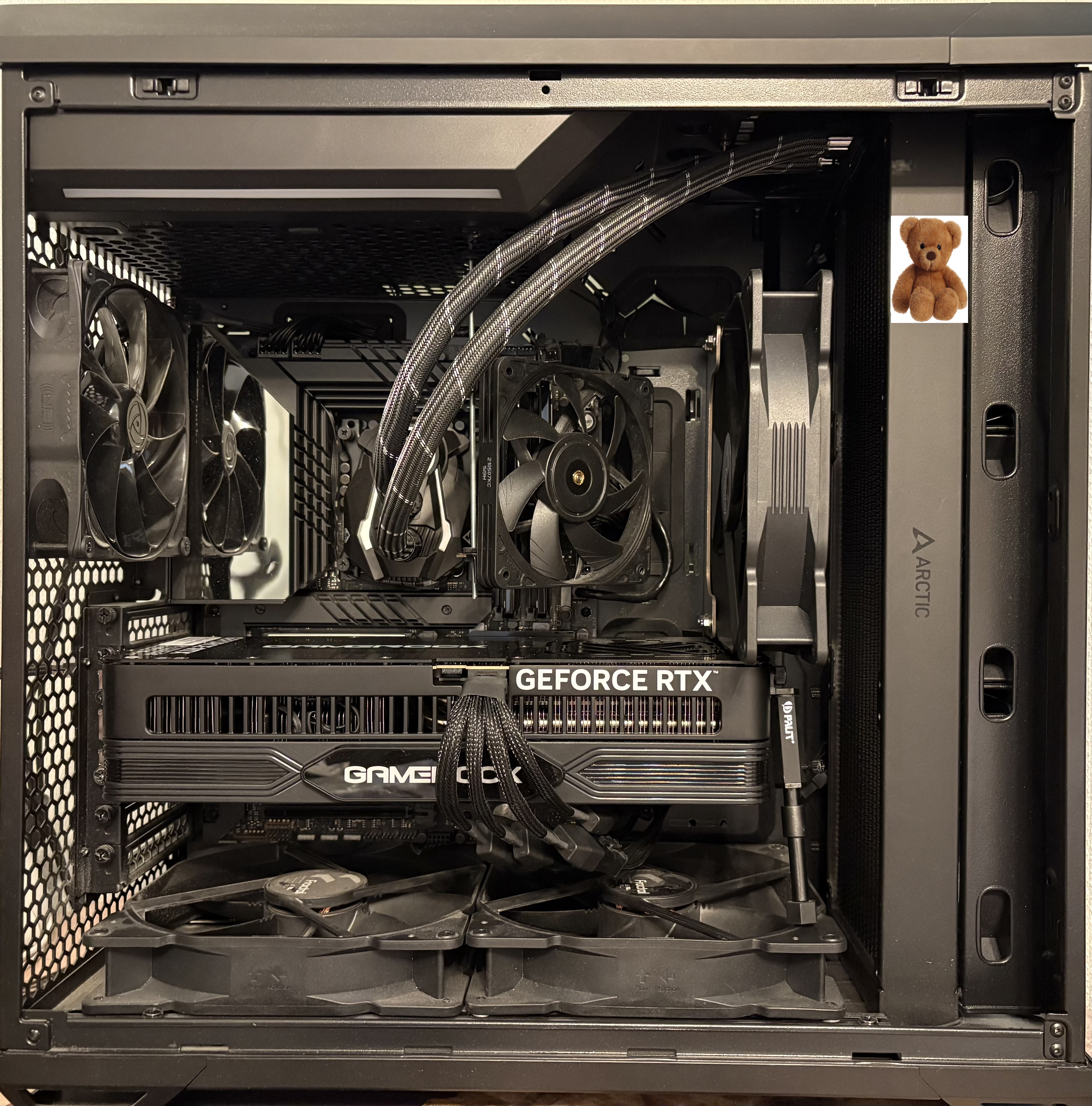 У меня TT Core 71, 2Х20см на фронте (560 оборотов), 1Х14см на выдуве (900 оборотов), АИО 360 сверху. Видяха в классическом положении. Винни-Пух Лиан ли 217 откровенно нравится.