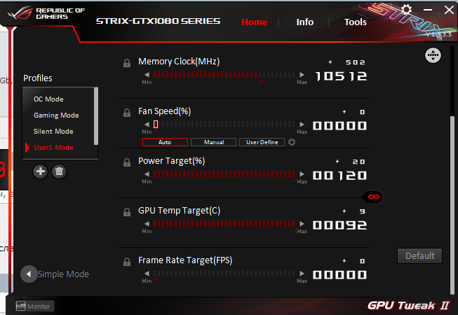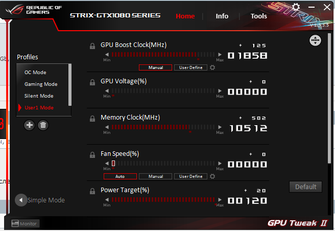 Взял старую 1080 стрикс от асус, по сравнению с охладом от msi gaming x 980 отличается шумом вентиляторов, звук не приятный становится уже свыше 1400 об. Сделал вообщем на постоянку 35% 1250об, включение при 56 градусов отключение при 45, температура в бф4 fhd 200% держалась 75 градусов ну и мини разгон 2000 по чипу и накинул +500 к памяти, вообщем не слышно её стало шум у msi gaming x более приятный на взлёте чем у асус.. На авто оборотах вообще набирает 1700 оборотов и режет уши)))