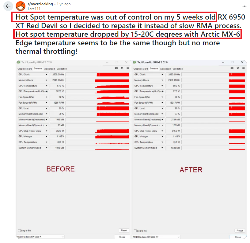 Мдаааа) Тут явно первое(и скорей всего) деградировала термопаста и они об этом не знают и думают что дельта в 30 градусов это "нормально" Или втрое кривой GPU или СО и поэтому такие показатели, но я не верю в это, это прям редкие случаи. Вы хотя бы открыли гугл и вбили temp hotspot любой карты RX 6000 и увидели, что ни на одной исправной новой, или обслуженной карте нет дельты в 30 градусов!