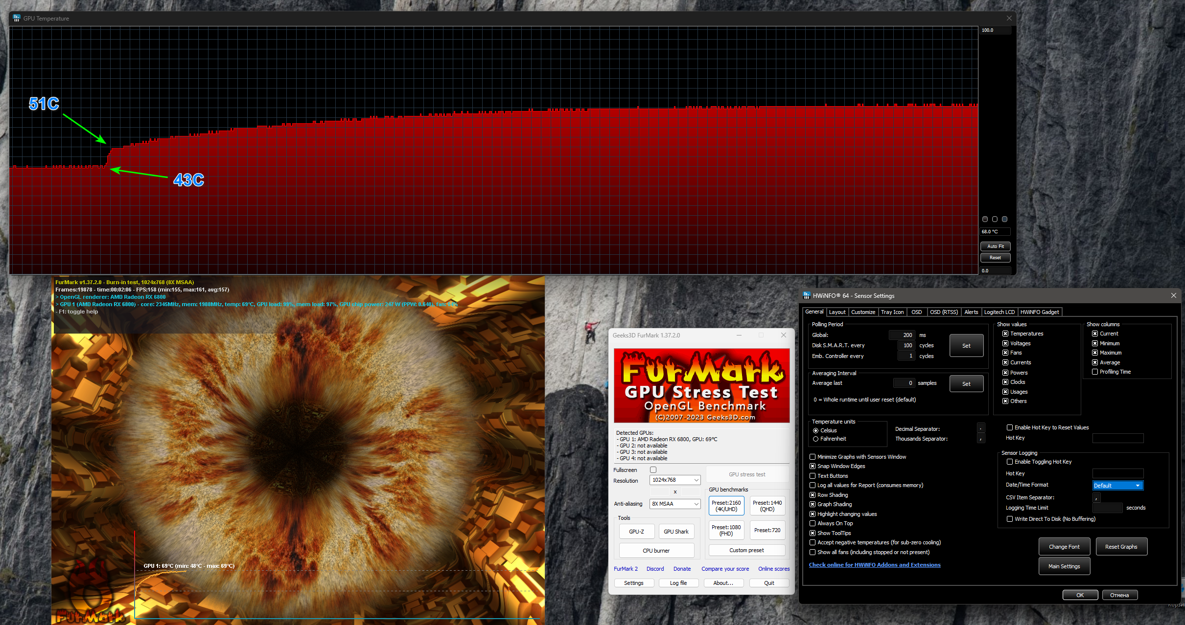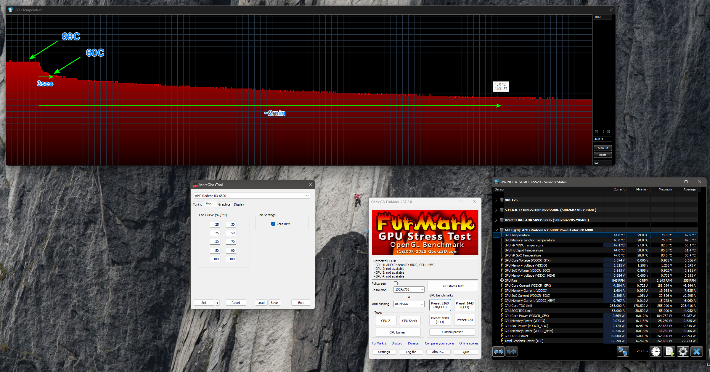 понятно, что восходящая кривая нагрева в таком случае будет плавнее, но и вы наверно видите, как быстро падает температура при снятии нагрузки, с игровых ~70, до ~50 в случае стопфан вкл, и ~30 стопфан выкл. Хозяин барин конечно, лично мне физически больно, когда карта испытывает такие перепады температур