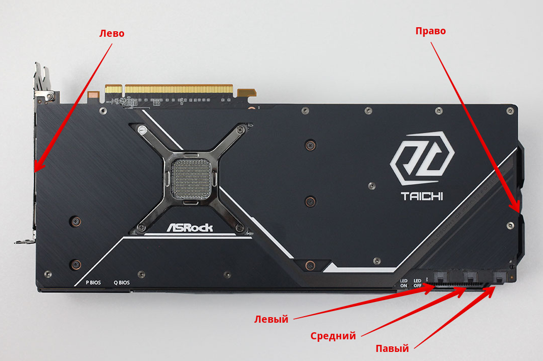 belayar ну вот если поставить карту в обычный ATX корпус, то слева на торце разъемы подключения мониторов, справа на торце концевики теплотрубок, на торце к вам лицом разъемы питания.