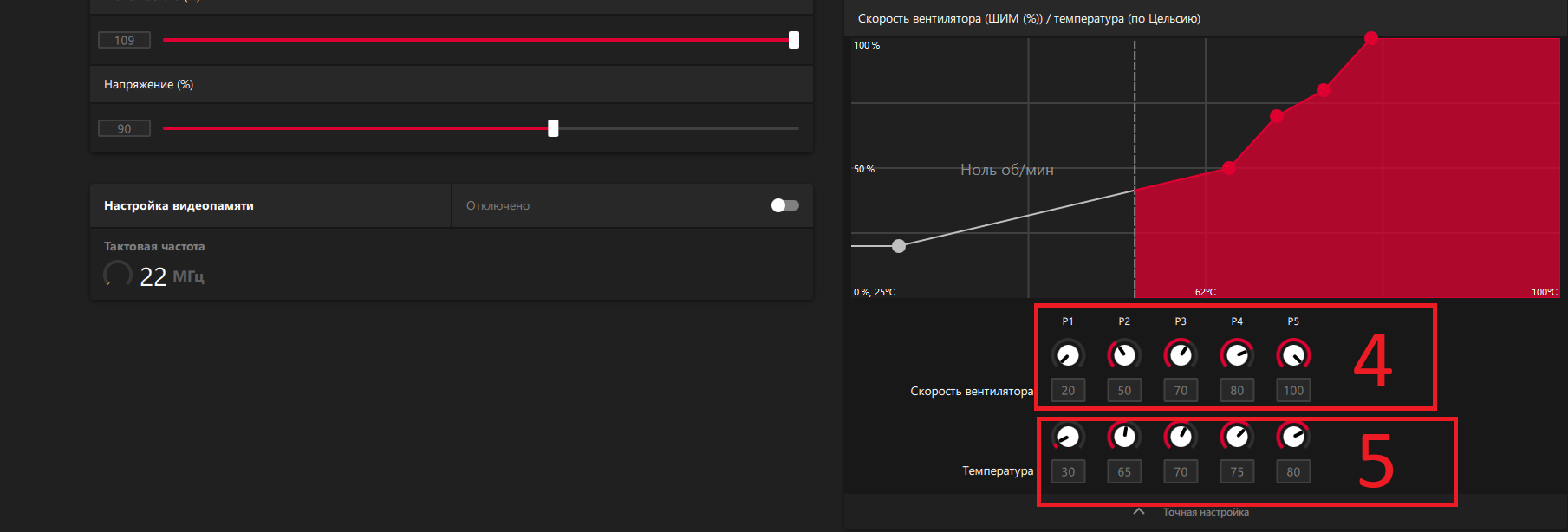 ALT+R Раздел производительность Вкладка Настройка Далее по цифрам: 1) Ручная Настройка Пользовательский 2) Настройка Вентилятора - Включено 3) Расширенное управление - Включено После открой раздел ТОЧНАЯ НАСТРОЙКА под 3 пунктом и над 4 пунктом. 4) Значения скорости вентилятора в процентах - устанавливай значения в процентах 5) Температура при которой будет выдавать скорость вентилятора - устанавливай значения в градусах После выбираешь кнопку которая активируется в правом верхнем углу - ПРИМИНИТЬ ИЗМЕНЕНИЯ