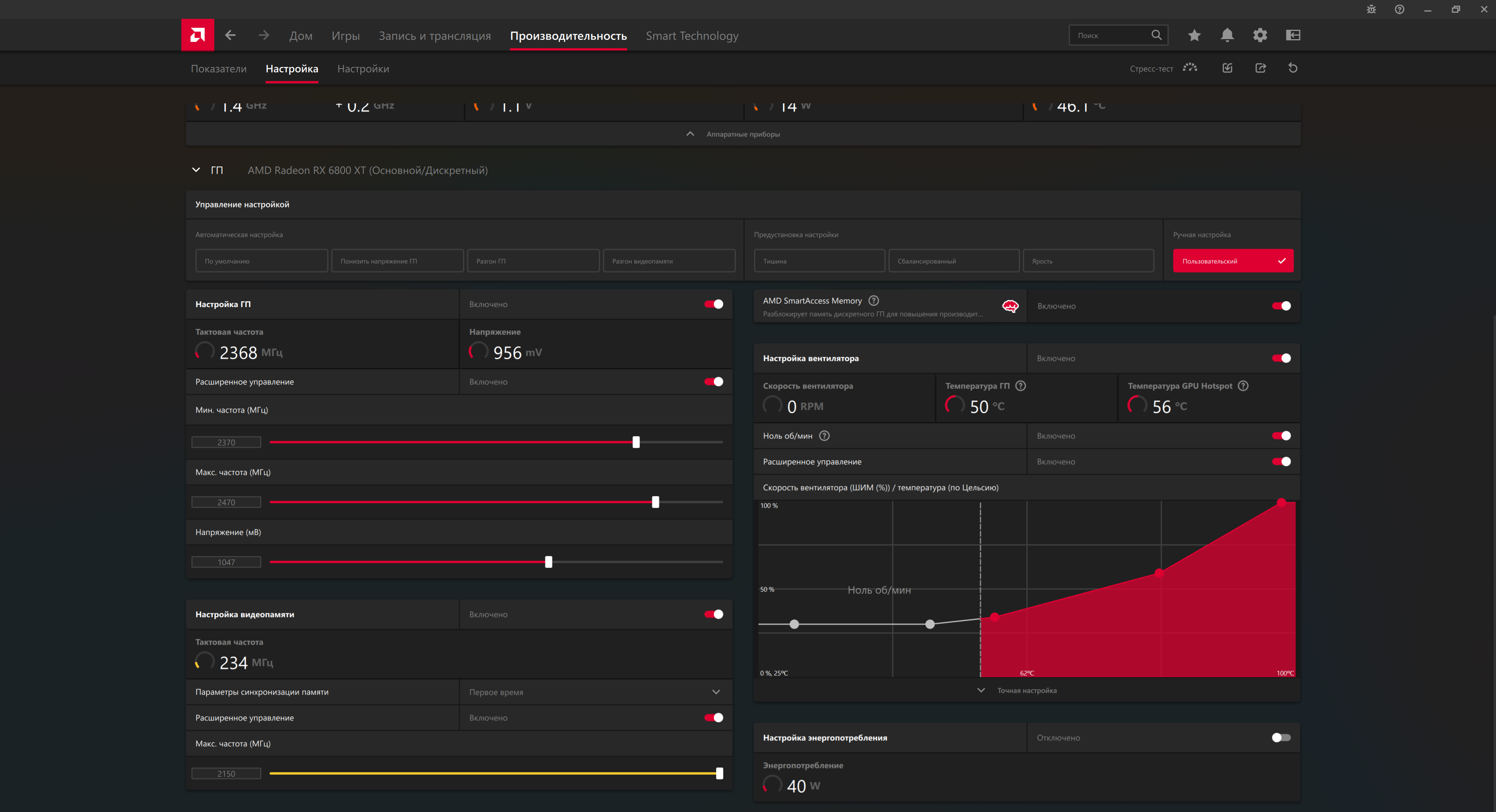 Как писал ранее производительность становится норм и карта грузится в пике до 272 ватт упираясь в лимит, который я не увеличивал, при переустановке дров с "аналогичными" настройками в том числе и профиль который тоже описал ранее (андервольтинге 2370-2470 память 2150 и 1047мв). А со временем начинает работать как будто какой то режим энергосбережения вкл и это видно физически что она начинает в пике просаживать фпс и 272ватта уже не наблюдается, среднее 222 пик 250 ватт, хотя настроек я не меняю в этом то и весь прикол, как и почему я понятия не имею.