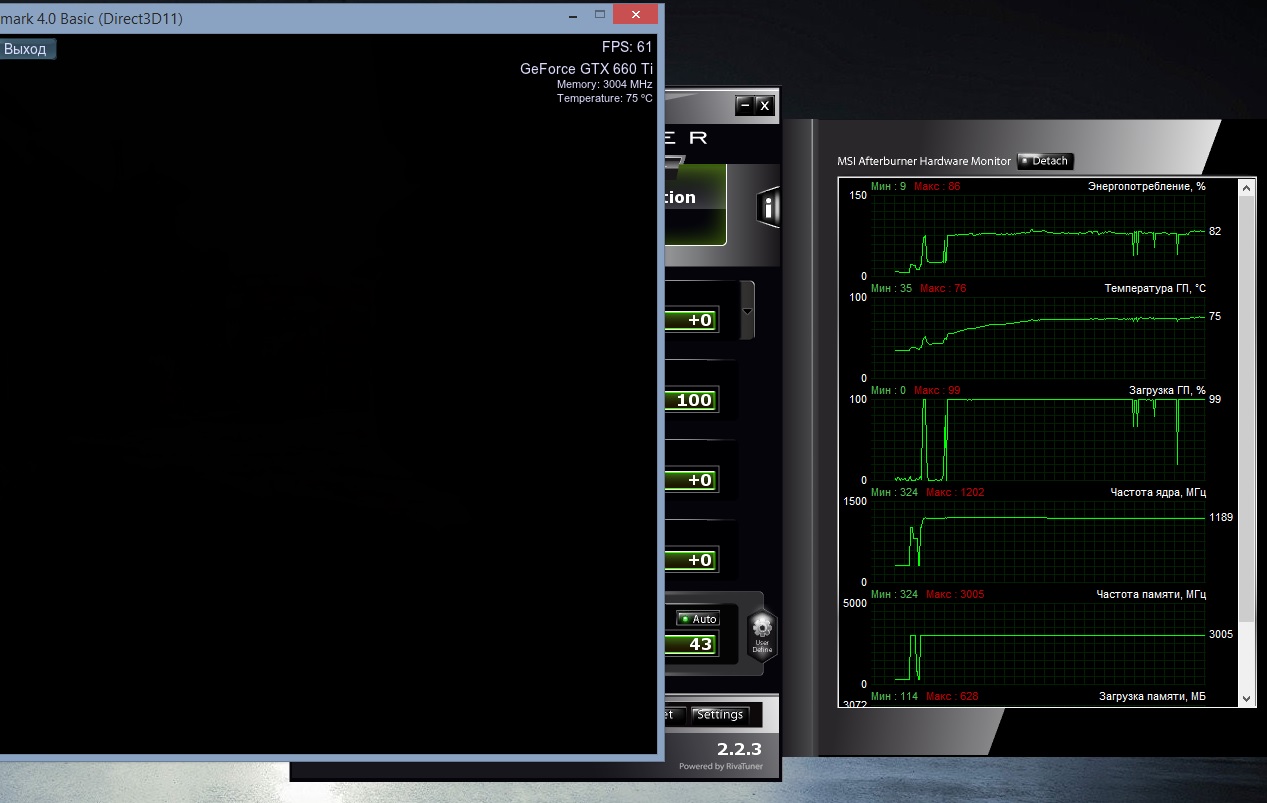 ребят такой вопрос,извеняюсь всю ветку не читал(взял видюху бу на замену 550 ти может ещё не позно вернуть) .ASUS GTX 660 TI-DC2-2GD5 суть в следующем по ощущение прирост вобще минималный .в нагрузке частота сама подымается до 1100.порт шдиим повреждён контакты в нём визуально не коротят.даже по ощущениям рабочий стол притормаживать стал.футурмарк и аида гпу стресс проходит без проблем температура 60с.причём частоту задирает в аиде,и гта 5 которая тоже тормозит на минимум-средние(550 на минималках прекрасно шла) в этих же тестах загрузка скачит от 0 до 99% как троттлинг(я так понимаю частота зашкаливает и он збрасывает нагрузку).в футурмарке частота доходит до 980 как и положено,и загрузка стабильно 99% косяк видюхи?или куда копать? проц е5450 3.3 гц,оперативки 7 гб,блок на 750 вт(взял спецально сегодня думал старый на 450 вт не тянет).