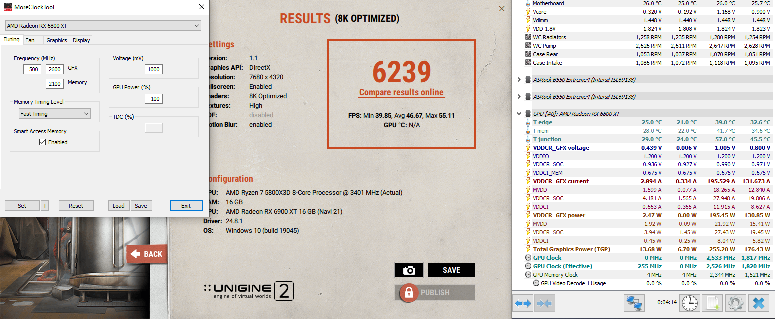 По разгону - для моей 6700xt red devil потолок в SP вышел в 2750-2850@2150FT@SAM@250w, в играх для стабильности минус 50гц, и не факт. На таких частотах при нагрузке UV у меня не работает, пробивает на 1.1мв по hwinfo (1.2 в драйвере), на выше уже нехватает вольтажа и tdp, я так понял, троттлит или вылетает. Снять эти два ограничения в MPT не вышло, как ни пытался. В итоге профит от разгона составил где то 5%, с поправкой на стабильность везде. По мне юзабельно только для бенчей.