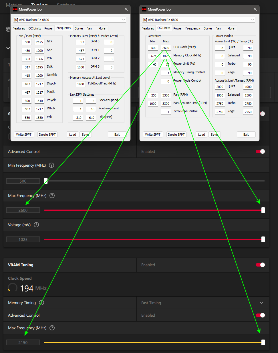 я поэтому сюда и пришёл, как человек, который разгонял через MPT RX5700, а затем ещё и зашивал модифицированные кривые в биос карты. последовательность там такая: 1) Расширяешь лимит на второй вкладке (Overdrive Limits), если необходимо 2) Ставишь нужную частоту ядра на 4-ой вкладке (Frequency) 3) Меняешь кривую на вкладке "Curve", так чтобы напряжение на заданной вторым пунктом частоте не было выше 1,2 В. Это всё)) А сейчас не понимаю, как на RX6700 разогнать через MPT? Кстати, MCT у меня даже не запускается ((