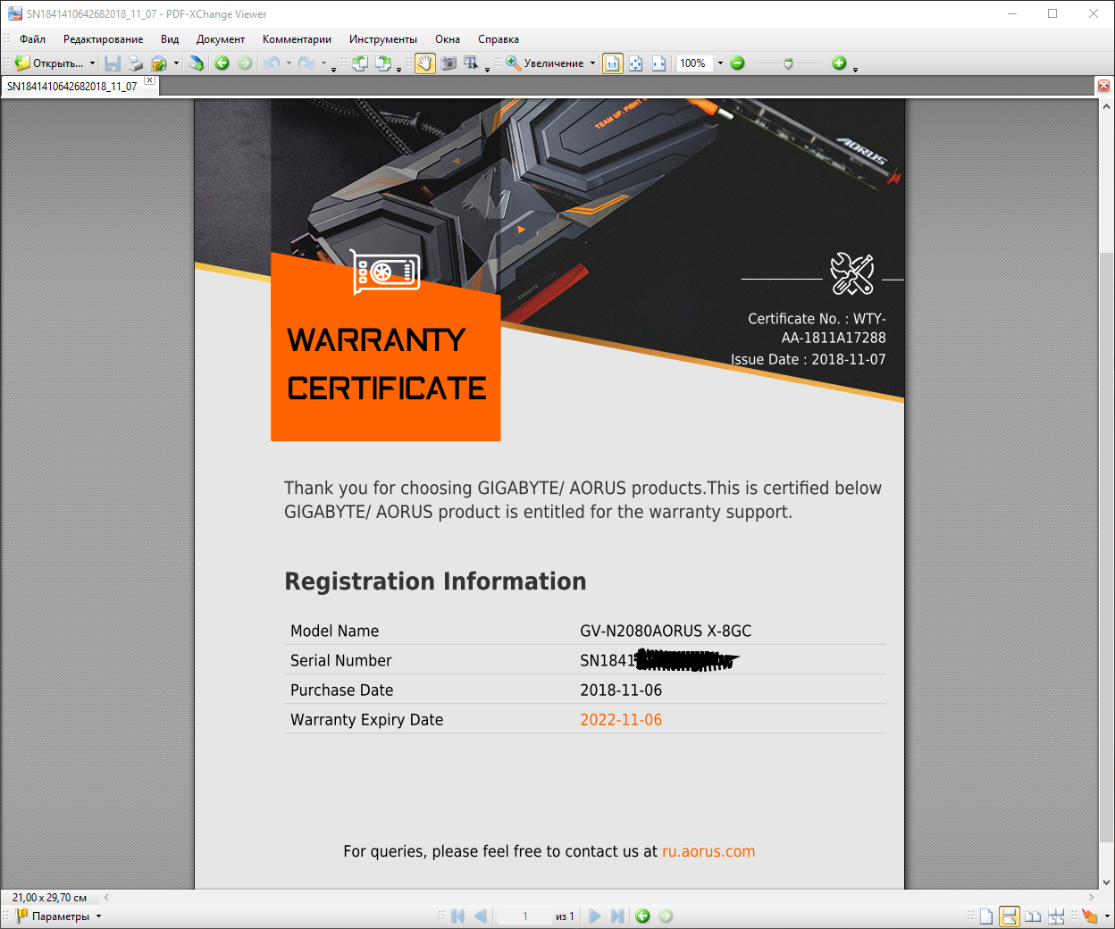 Добрый день. Здесь нужно ввести серийный номер продукта https://registration.aorus.com/ После этого при наступлении гарантийного случая вы присылаете нам подтверждение регистрации и мы свяжемся с продавцом и подтвердим дополнительную гарантию.