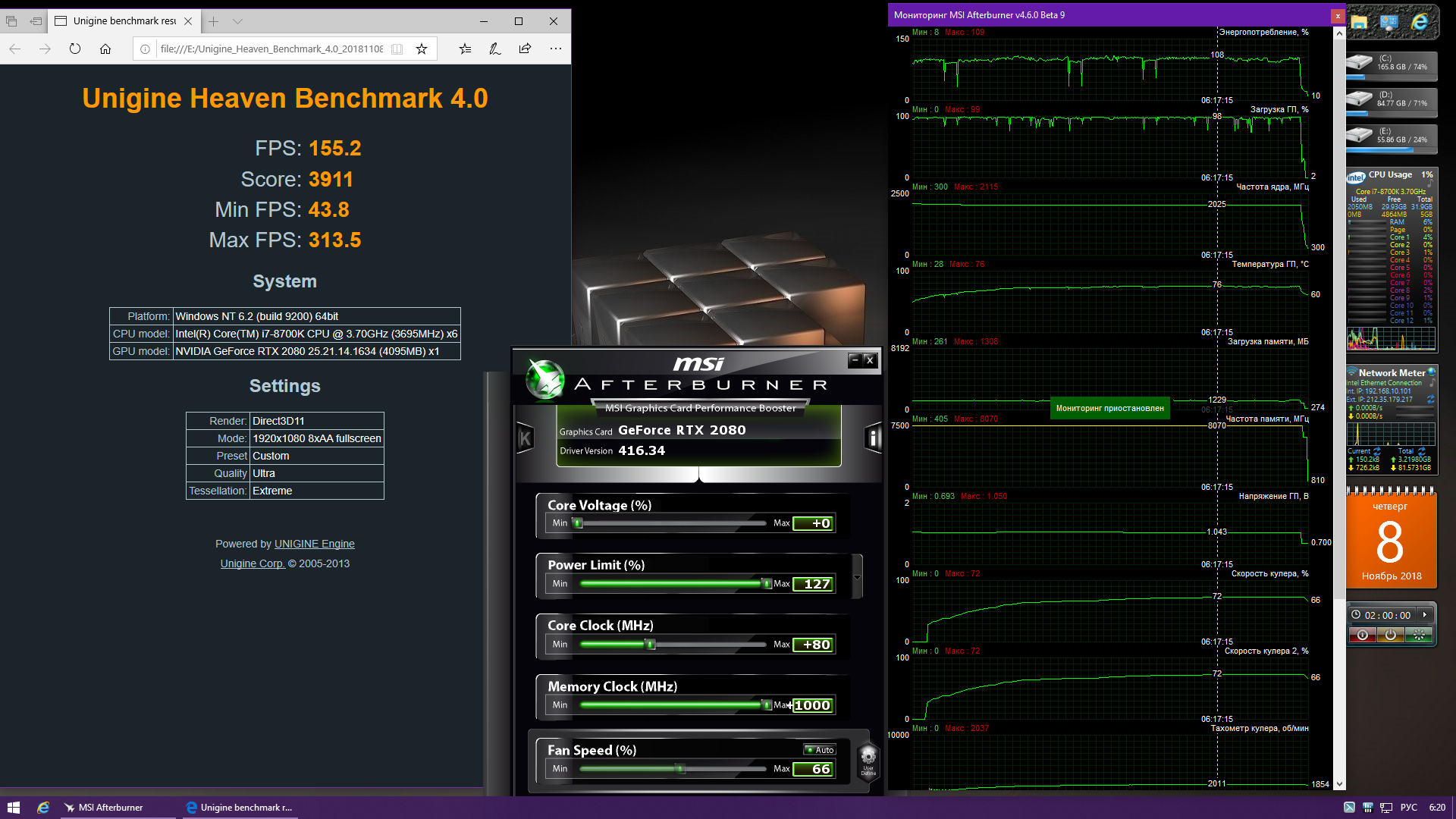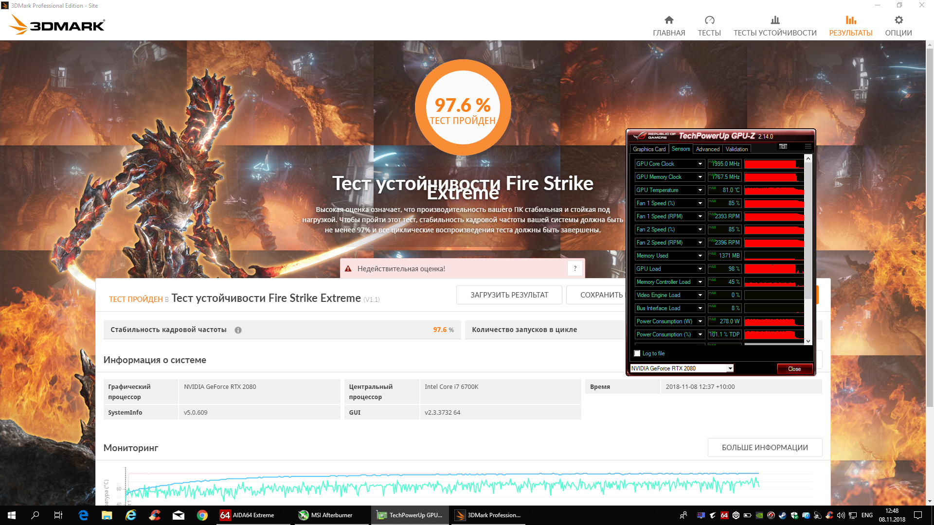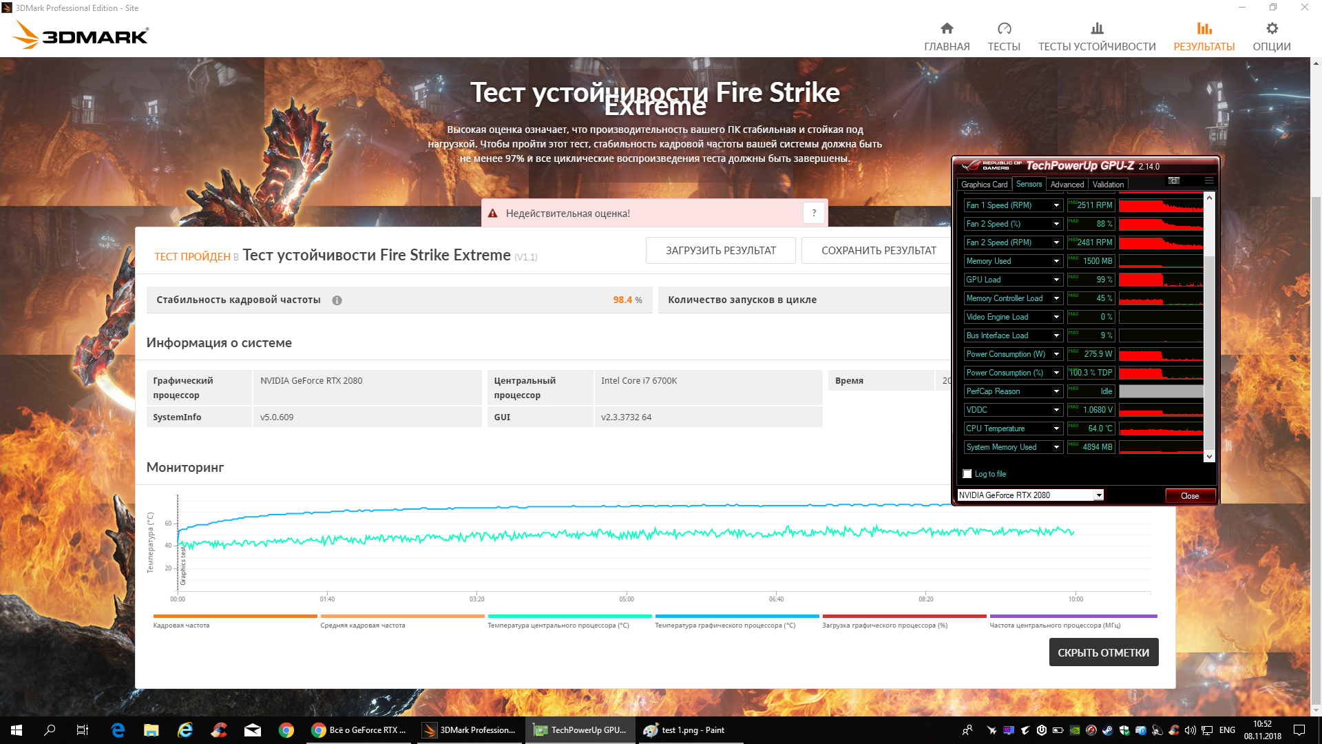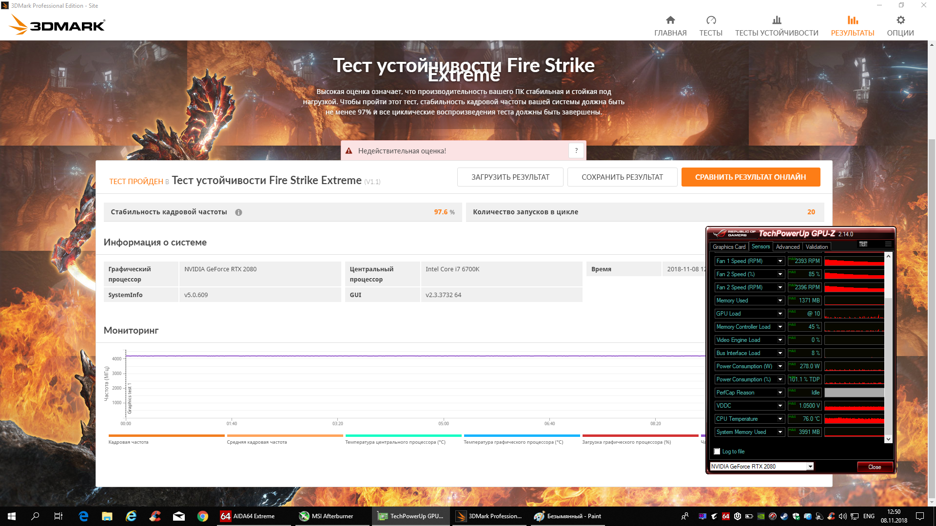 вот сделал пару Тест устойчивости Fire Strike Extreme. тут поставил обороты на видеокарта 80'(100%) и увеличил обороты на проце.