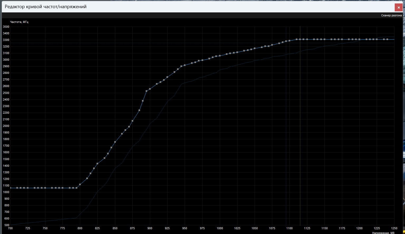 2. После того, как курва предельно поднята, но все точки частота/напряжение сохраняют стабильность (=успешно прошли весь указанный выше ОССТ тест), нам достаточно пристреляться лишь по верхней точке (показываемые частота/напряжение при 10% нагрузки в тесте) и нижней (100% нагрузки) - на остальных точках стаб мы получим автоматом в 95% случаев (если не ковыряли отдельные точки вверх руками). "Пристреляться" = поднял всю курву через альт или погнул её через ctrl - потестировал. Тест проходит - поднял/погнул ещё. Нашёл, где стабильность потерялась - опустил всю курву до стабильного значения "нестабильной" точки и запомнил её - её больше превышать нельзя. Далее пробуем гнуть противоположную часть кривой, чтобы понять, какой запас остался там. Другими словами: цель = найти нестабильную частоту для напряжения 1,1в (у кого-то 1,075в или около того и выше не поднимется) в тесте 10% нагрузки и спустить её на 15-30 МГц до стабильности. Запомнить. Затем найти такую же точку при 100% нагрузки (например, у кого-то это будет 2400 и 0,85в). Запомнить. Далее, нужно минимально простыми манипуляциями со всей курвой целиком поднять и наклонить всю кривую так, чтобы она проходила через две точки, что мы ранее запомнили.