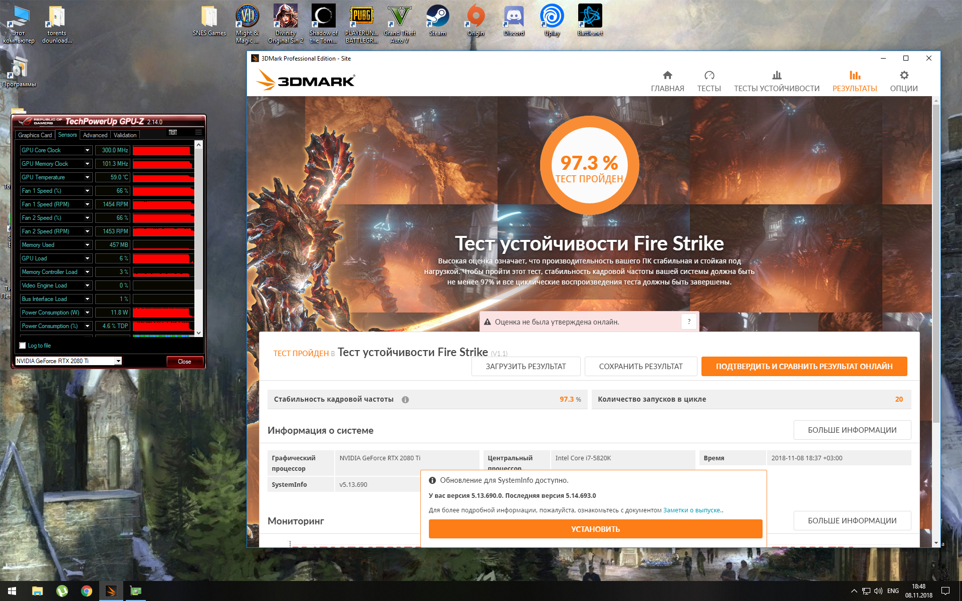 Приходится сменить статус читателя. На прошлой неделе получил PALIT GeForce RTX 2080 TI GamingPro 11GB. Поставил, включил, всё норм. Полюбовался подсветкой, установил начисто драйвера, заглянул в диспетчер устройств, всё норм. Только собрался запустить GPU Z, почернел экран и завыли на полную вертушки охлаждения ВК. Попрбовал перезагрузить, тож самое. Подсветка не горит, вертушки воют, экран чёрный, БИОС мамки сигналит о неисправности ВК. Отнёс обратно, сказали пару недель придётся ждать. Вот сижу, читаю форум и завидую