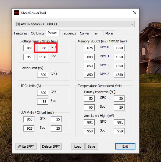 Подскажите, через MorePowerTool возможно сделать андервольт видеокарты? Имеется ноутбук с RX 6650M со стоковым тдп 80вт, с помощью MPT поднял тдп до 100вт, все работает хорошо, но хотелось бы еще снизить напряжение. Если в MPT вручную ограничивать максимальное напряжение до 900mv, то за ним падает и частота до 2200мгц. Возможно как-то снижать напряжение независимо от частоты? Через adrenalin и msi afterburner никакие настройки править не дает.