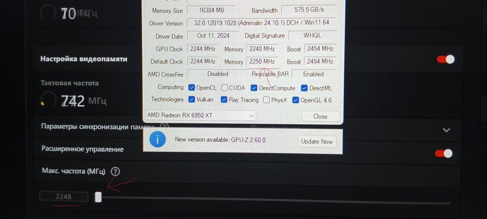 Верхняя строчка которая показывает 2248 МГц должна показывать разогнанную память или не разогнанную в зависимости разгоняли вы её или нет, а нижняя строчка показывает дефолтное значение которое должно быть то есть 2250МГц такое значение должно быть и в верхней и нижней строчке по умолчанию если видеопамять не разгонялась я же получается разогнал её в меньшую частоту на 2248МГц это баг драйверов ни на одной другой карте кроме 6950xt такого нет если на обычной 6900хт что в верхней что в нижней строчке показано 2000МГц то оно так и есть, да и на других картах так же