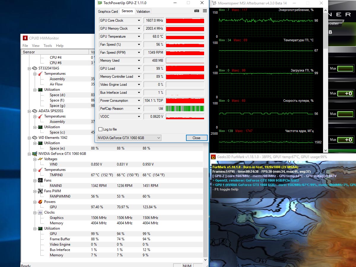 Решил не затягивать и сделал прогон в Фурмарке. Extreme Burn и Post FX включены, 2xmsaa. Все так же. 140 мм 800 об. на вдув, 120 мм 1000 об. на выдув. Расположение корпуса - нижнее, не изолированное стенками шкафа, тканью и другими навесными конструкциями. Корпус закрыт. Расстояние от точки размещения видеокарты до уха около полутора метров. Обороты со выставлены в 1200 или 50%. Шум вентилятора на 50% можно охарактеризовать в ночное время как очень тихий. В дневное время не будет слышно вообще. Во всяком случае в моем корпусе. С такими оборотами получились следующие результаты. Учтите, что нагрузка в играх будет ниже, при этом остается большой запас по скорости и уровню шума со даже в условиях стресс теста. Иными словами, результаты данной видеокарты можно назвать отличными.