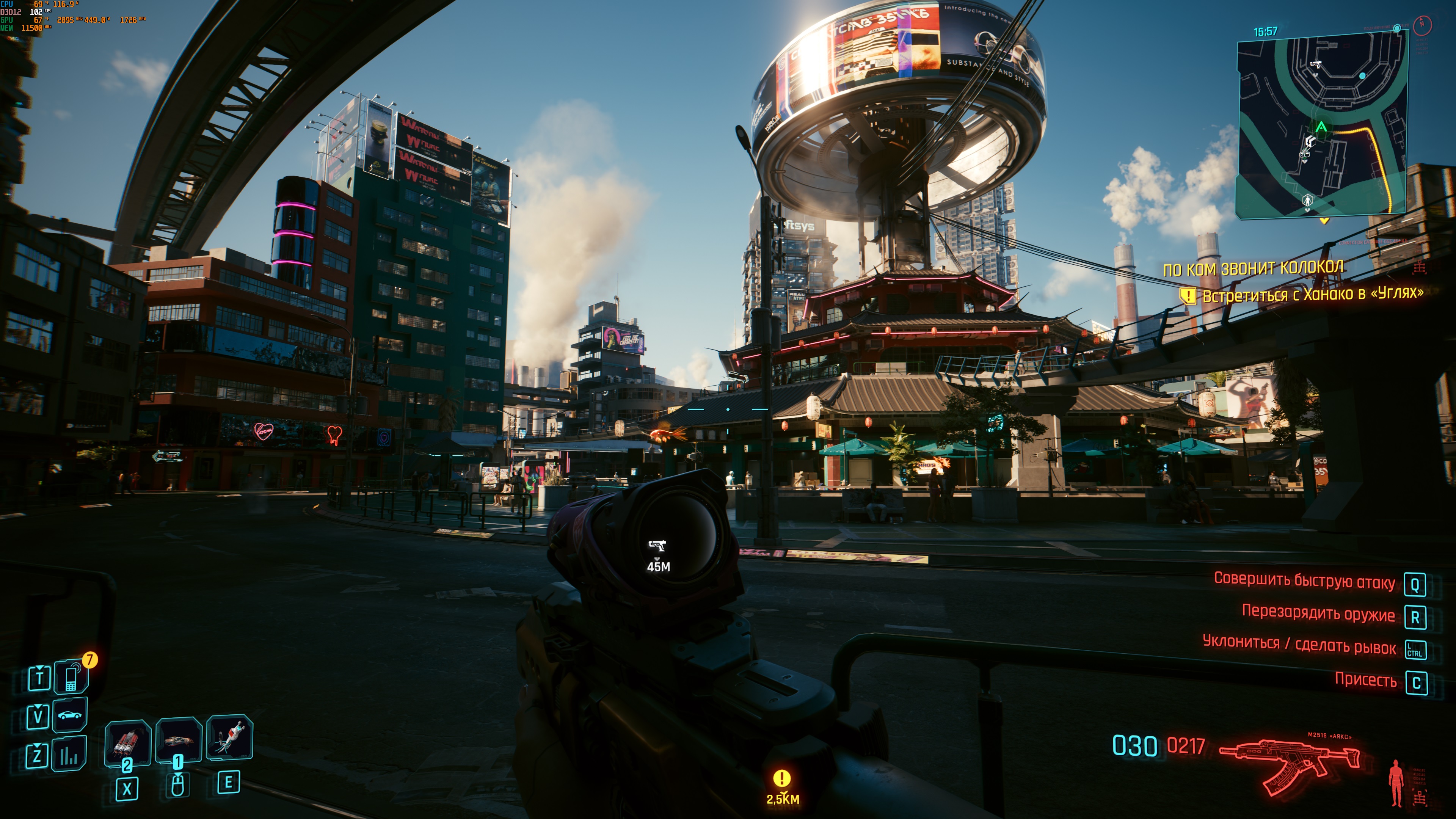 Палит 5090 Геймрок ОС в стоке. Все настройки игры на полный максимум. ДЛСС - качество. Строка видяхи: температура гпу/загрузка гпу/частота ядра/потребление/скорость в % вентиляторов гпу/частота вращения вентилятров гпу/напряжение гпу